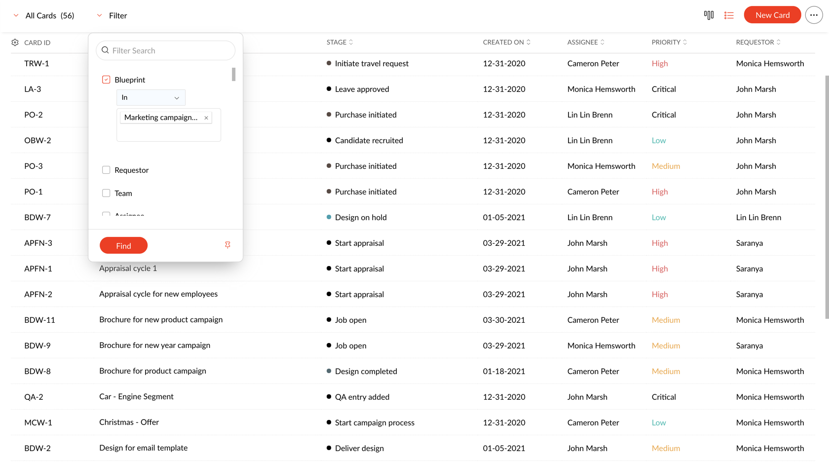 - Para mover um cartão para outro blueprint, certifique-se de que os critérios do outro blueprint correspondam ao cartão.