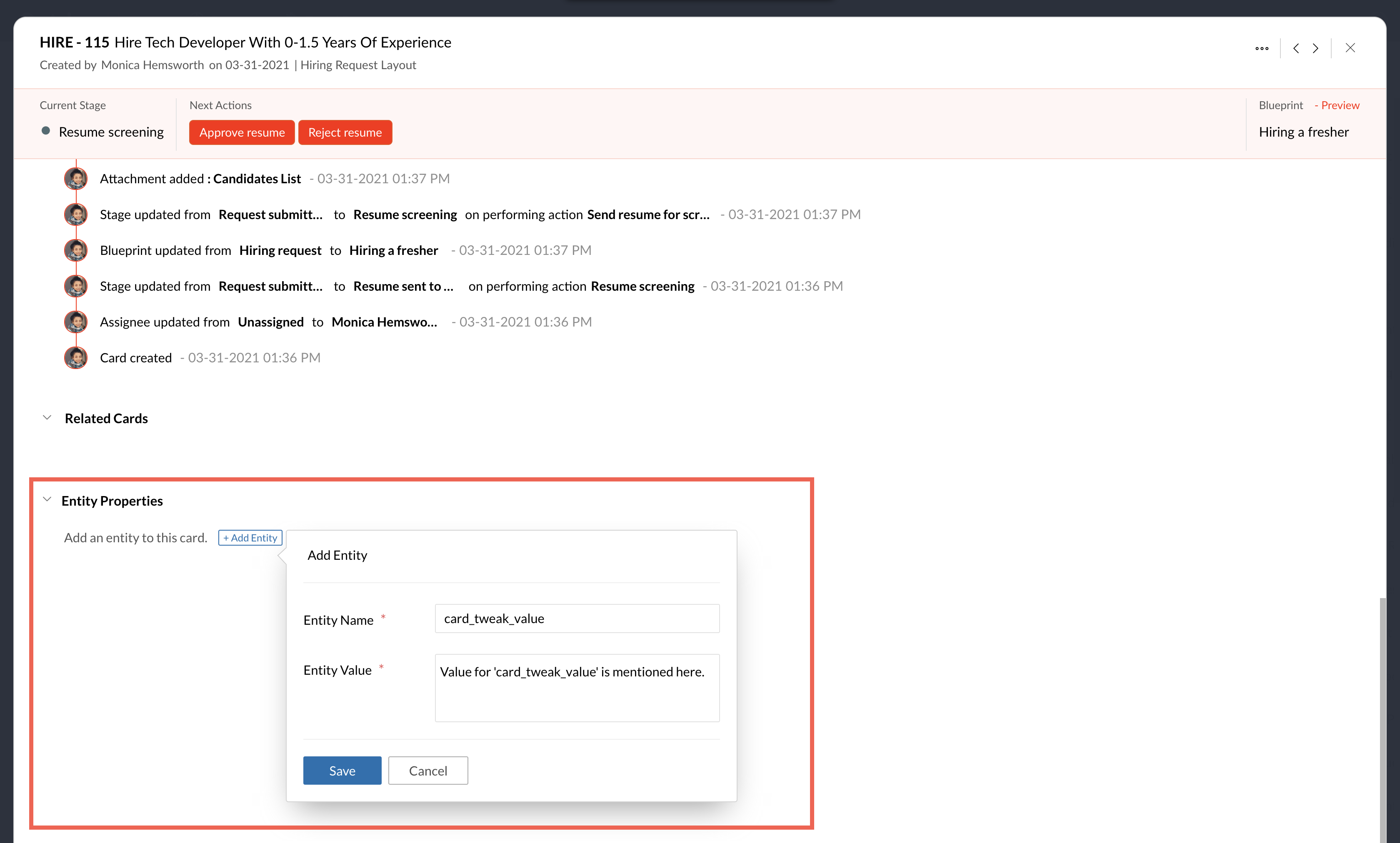 - Clique no botão Adicionar entidade e insira o nome e o valor da entidade.