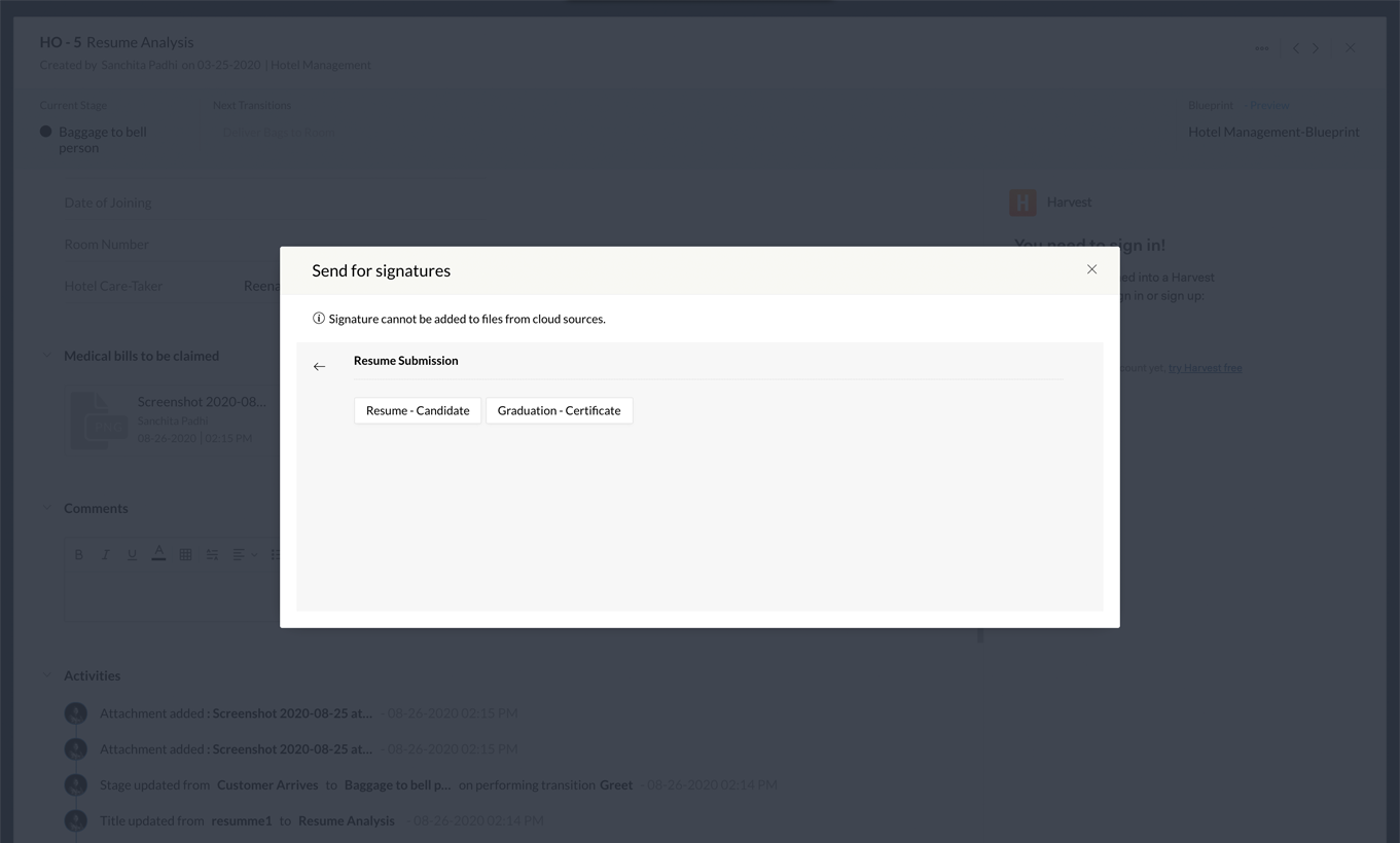 Você será redirecionado para o Qntrl e um e-mail de solicitação será acionado aos destinatários. O status dos documentos pode ser rastreado a partir de atividades de assinatura.