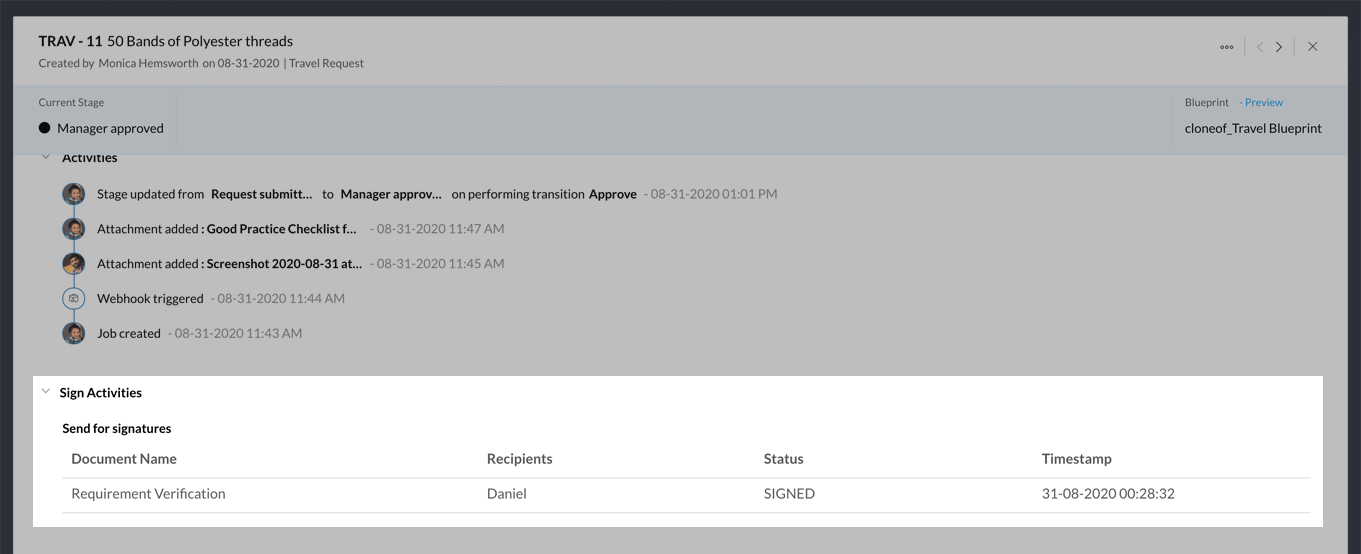 Você pode exibir os detalhes do documento assinado em Atividades da assinatura . Se você optou por salvar o documento assinado, uma cópia dele será adicionada aos anexos.