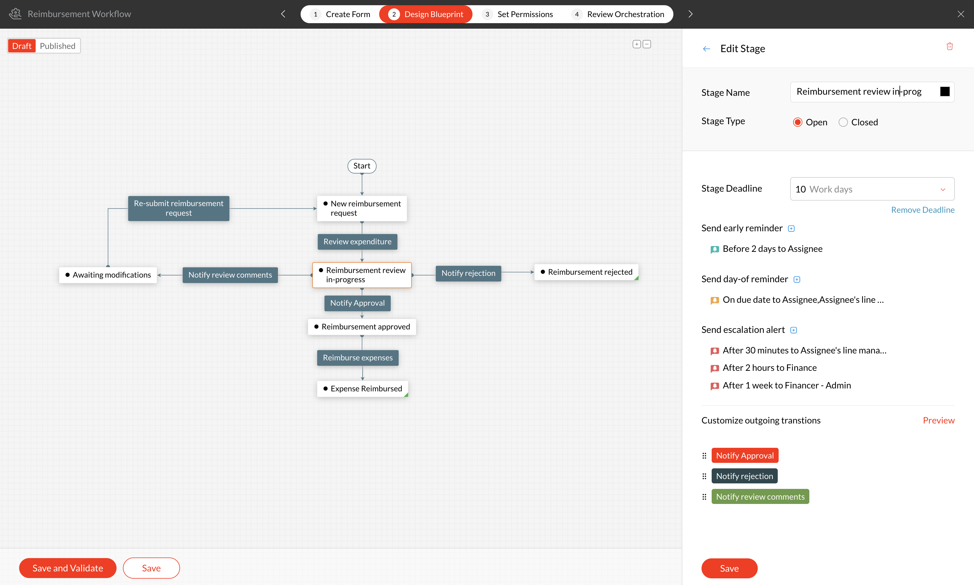 O fluxo de trabalho de Reembolso de Helen contém etapas como revisão, aprovação e rejeição. Vamos ver como podemos criar um Blueprint para ele.