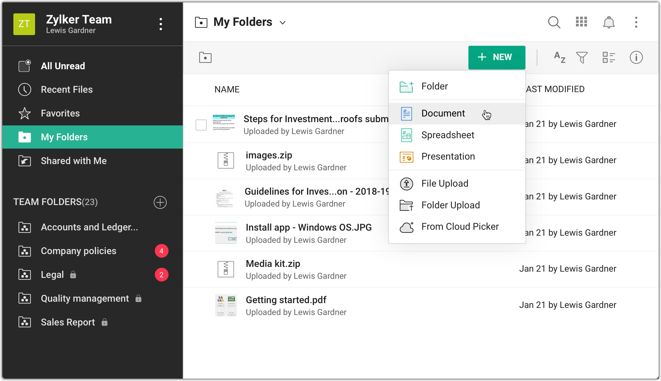 No Zoho WorkDrive, Minhas pastas é um espaço privado em que você pode criar arquivos, armazenar arquivos e compartilhá-los com colegas. Mover arquivos e pastas internamente em Minhas pastas Entre na sua conta do WorkDrive. Clique em Minhas pastas no ...