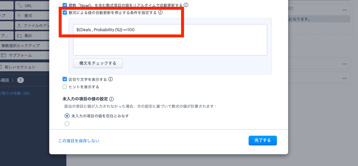 数式項目のプロパティに関数「Now()」を含む数式項目の値をリアルタイムで自動更新するというチェックボックスを導入しました。