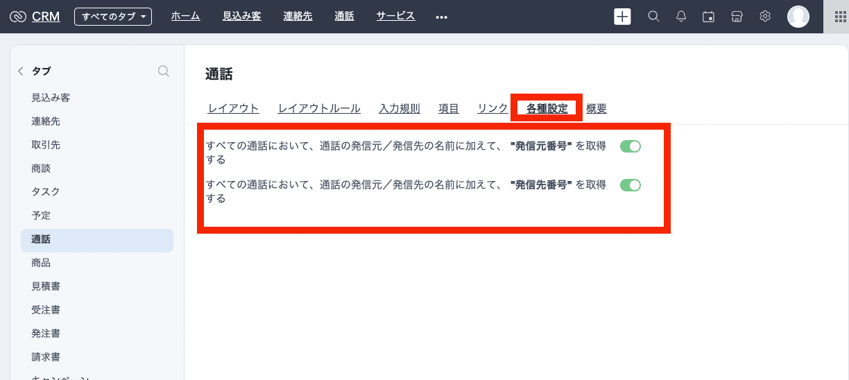 ・電話連携が有効な場合、[発信元番号]および[発信先番号]項目は通話のレイアウトに自動で追加され、通話タブ>各種設定で、発信元番号と発信先番号が有効になります。