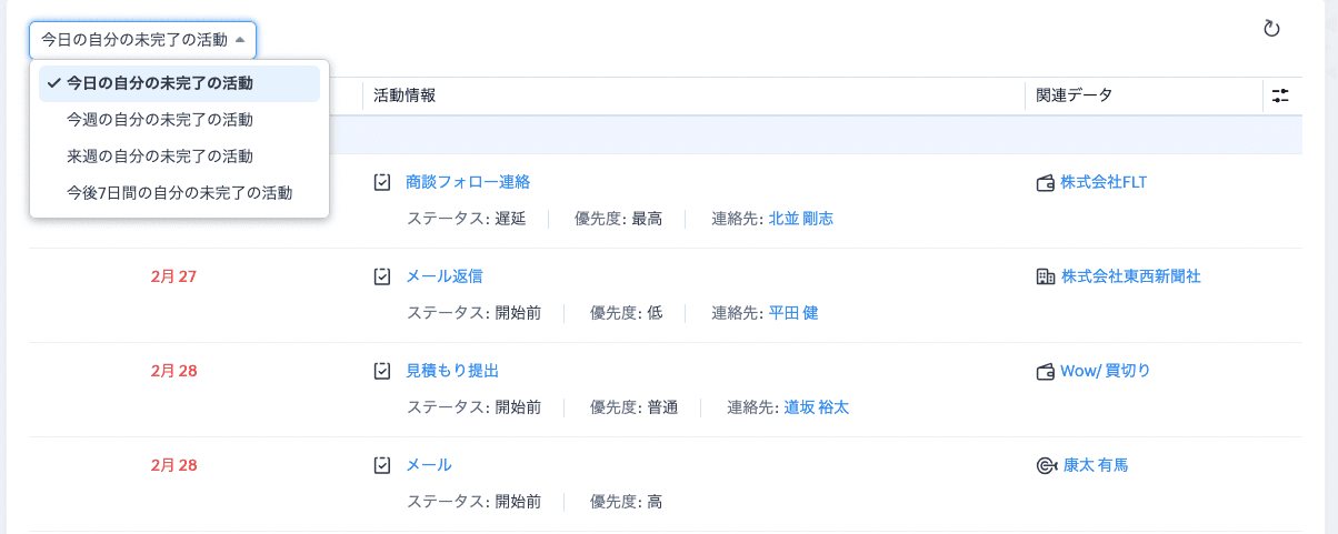 選択した期間に応じて、タスク、予定、通話、予約などの未完了の活動を一目で確認できます。