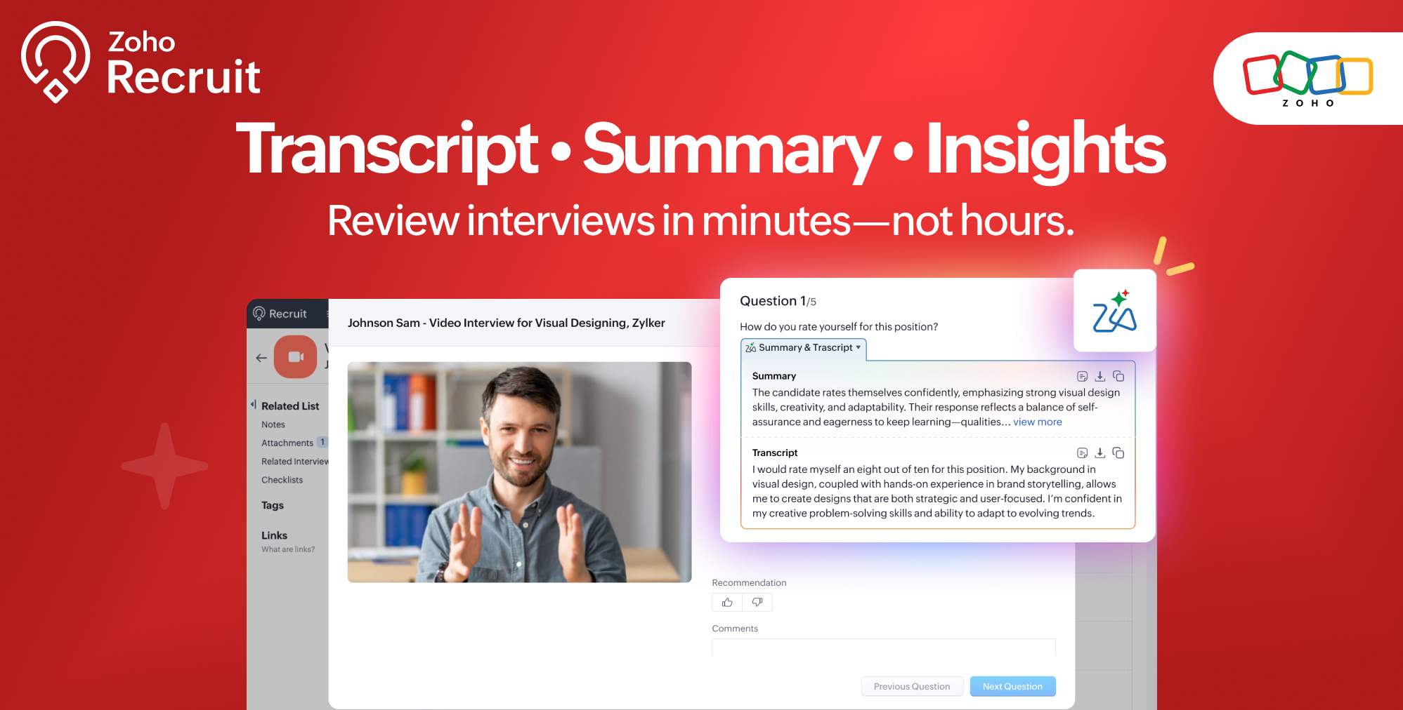 Evaluating interviews shouldn’t require replaying long recordings or taking manual notes. With AI Interview Insights, you can now review complete transcripts and AI-generated summaries of your One-way (Recorded) interviews right inside Zoho Recruit.