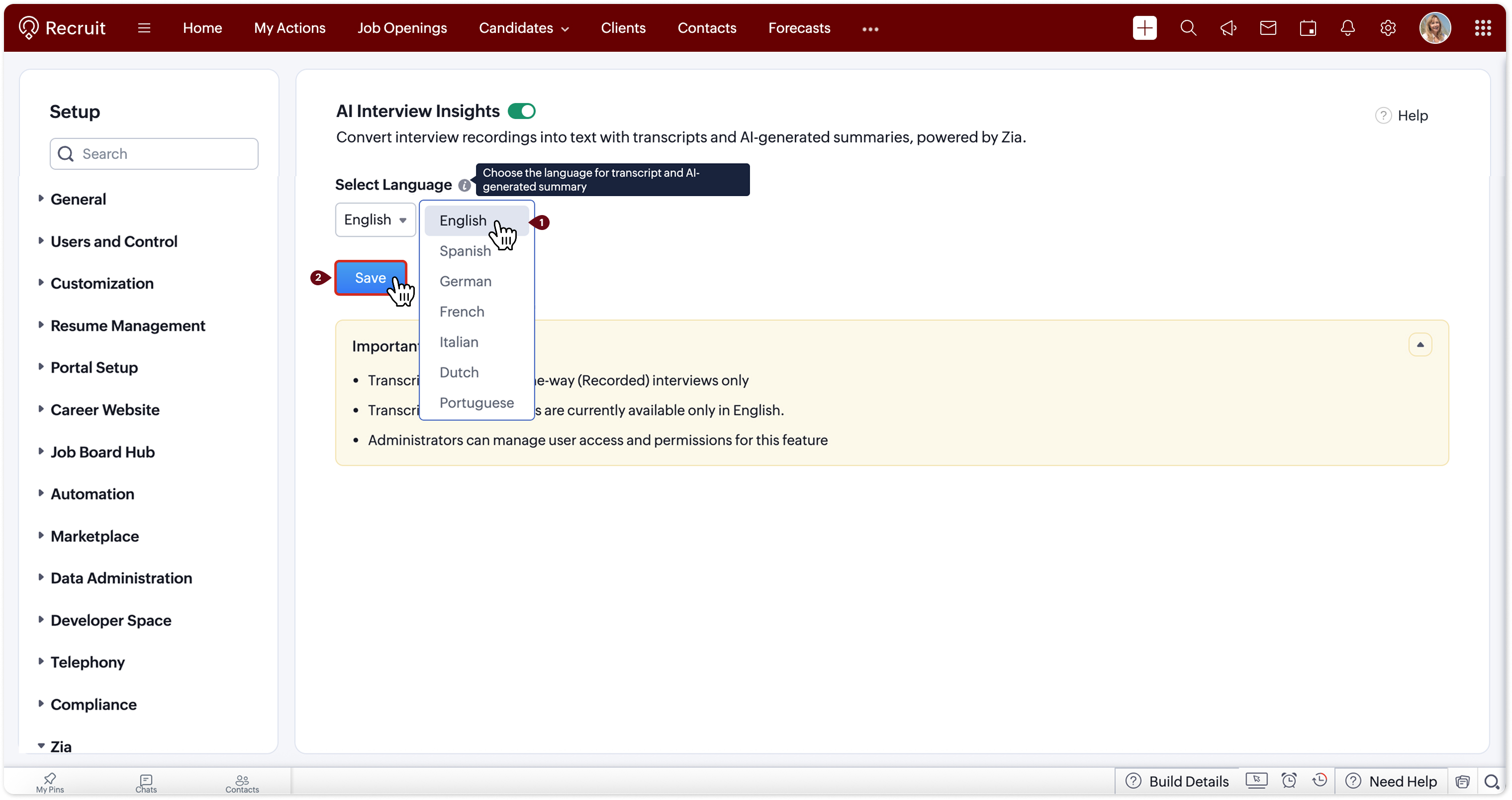 Go to Setup > Zia > AI Interview Insights, enable the toggle, and choose your preferred transcript/summary language.