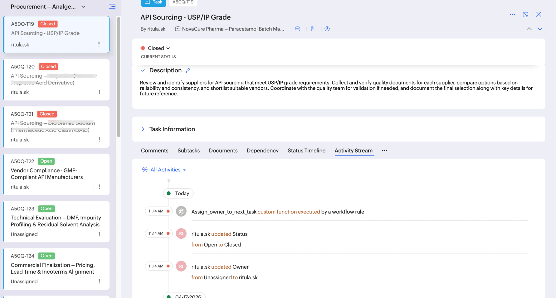Use-caseIn a pharmaceutical manufacturing unit, the procurement phase involves a set of tasks such as raw material sourcing, quality checks, approvals etc. These tasks are often repetitive and handled within the task list. Even if tasks are added by different teams based on requirements, and the list continues to expand, task ownership might remain unassigned until a user is assigned manually. This delays the other upcoming tasks and project timelines.