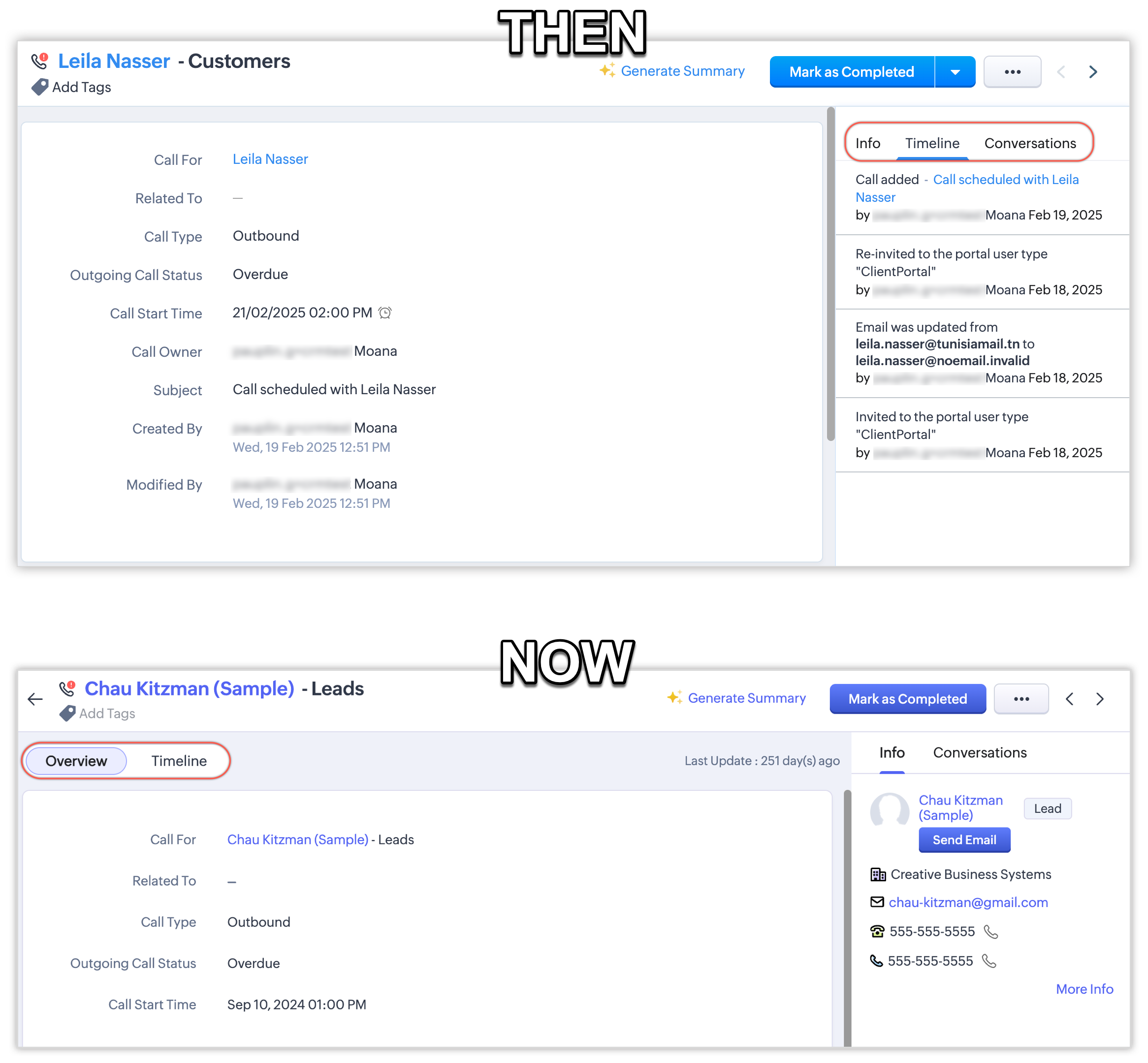 Previously, the Timeline tab in the Meetings, Calls, and Tasks modules was situated in the right panel of the record detail page, between the Info and Conversations tabs. We've moved it to the main space beside the Overview tab, like in the other modules. This applies to both records with and without contact associations.