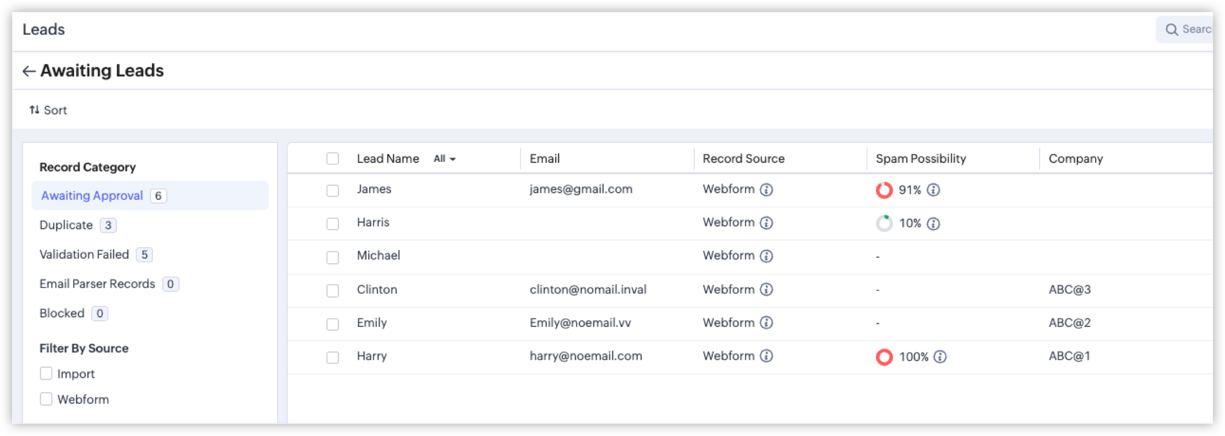 In contrast, suspicious submissions are flagged as potentially spam and held back for manual approval in the usual record approval page called, Awaiting Leads (previously known as Approve Leads). These records are assigned a Spam Possibility Score based on the identified suspicious factors.