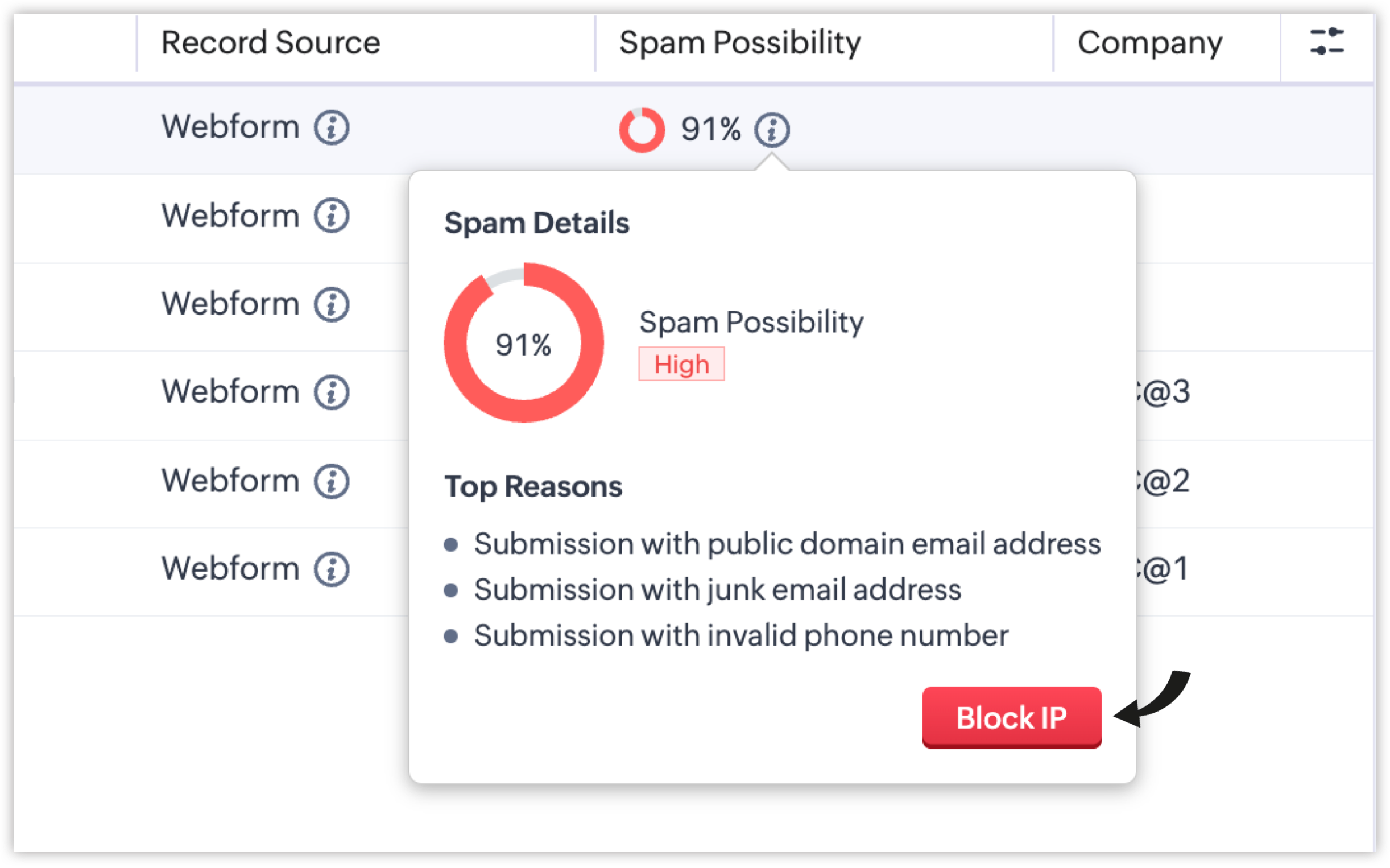 The new Spam Possibility column indicates the spam probability for each record as a percentage. You can also view the top reasons behind the scores of the spam record by hovering over the info icon beside it.