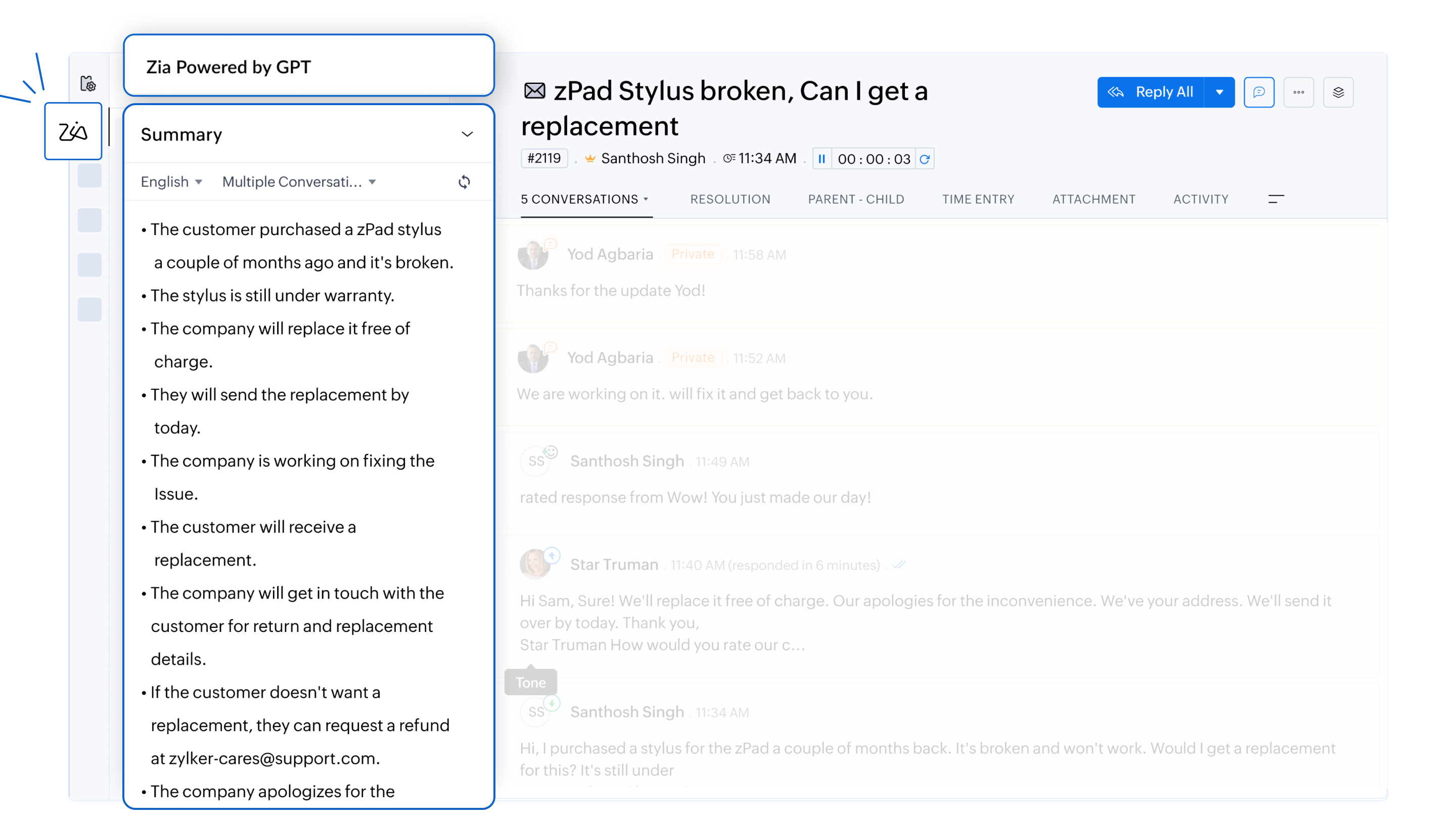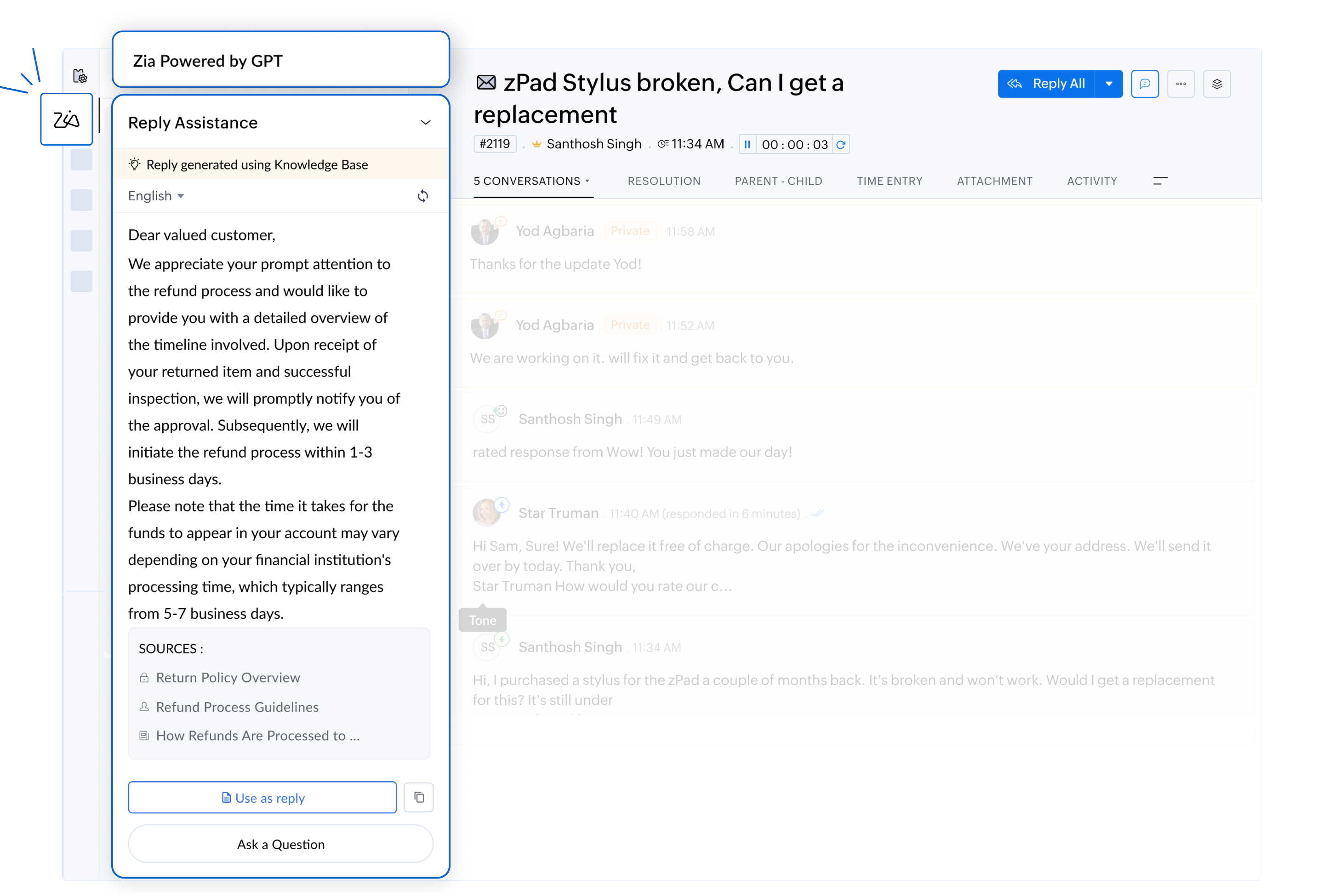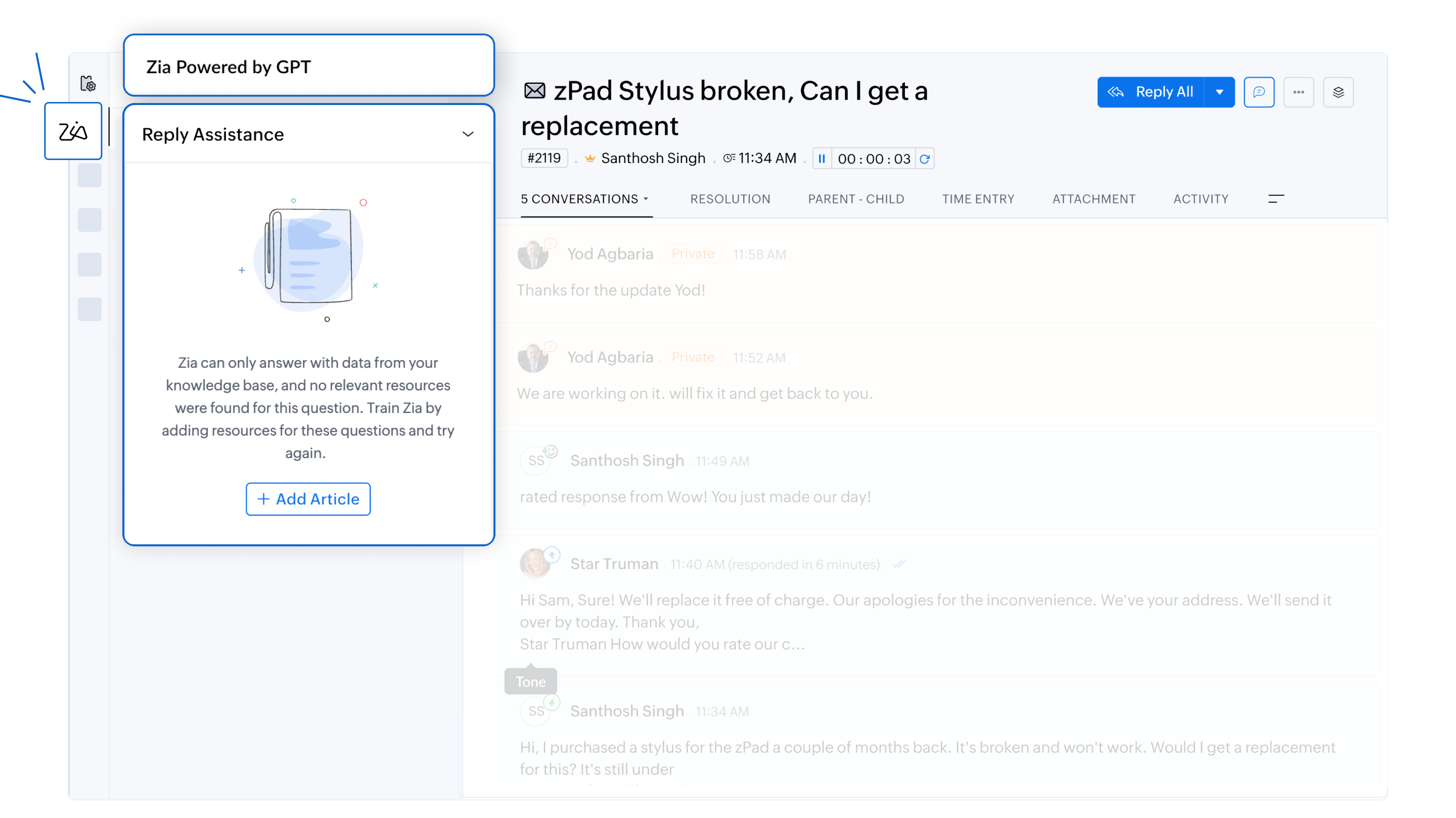 Zia analyzes customer inquiries and drafts responses based on the information available in the knowledge base articles. Whether it’s addressing policy-related questions or providing troubleshooting guides, agents can resolve issues faster.
