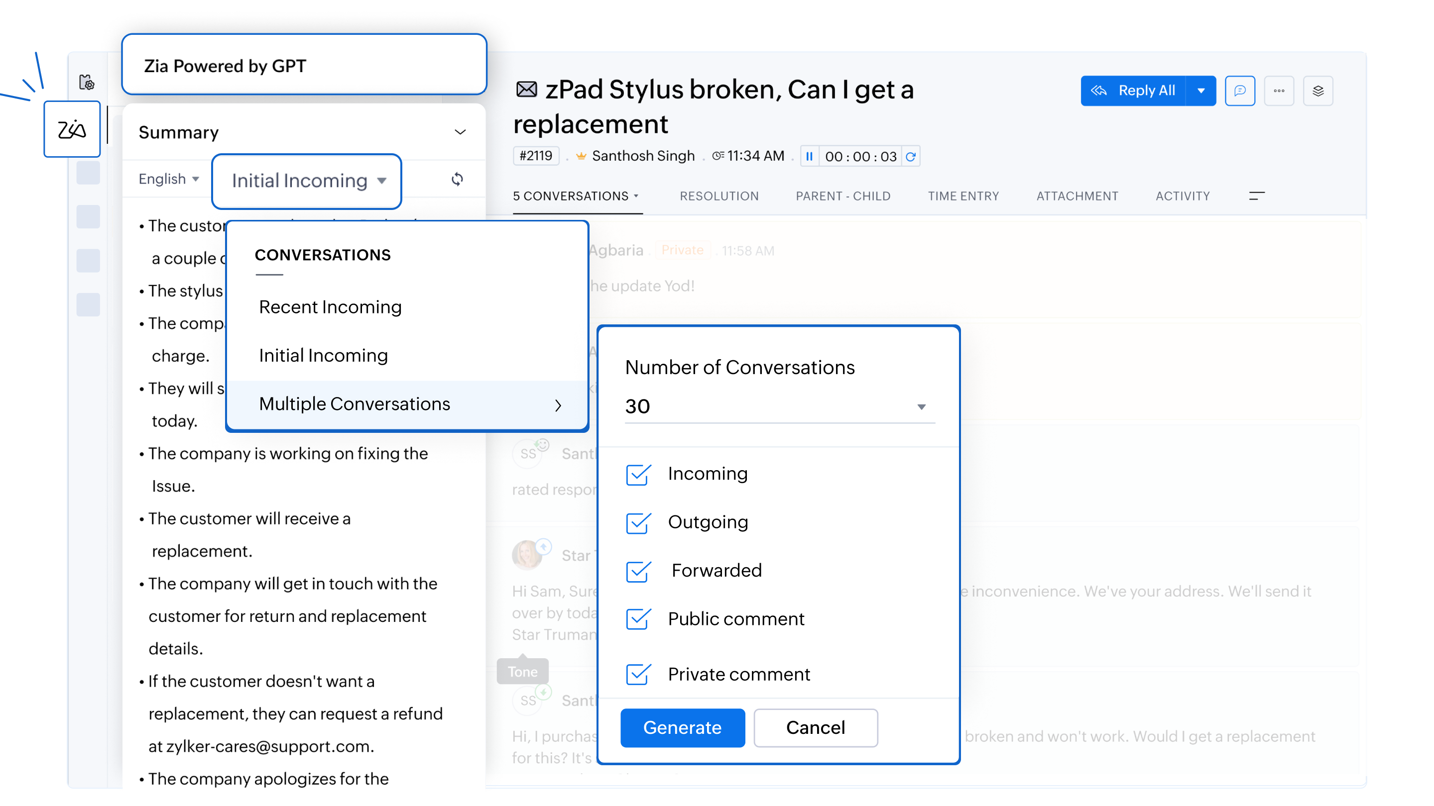 Zia provides concise summaries of incoming inquiries and previous conversations within a ticket. Agents can choose from different options, including recent, initial, or multiple ticket conversations (up to five), which cover all types of interactions—such as incoming, outgoing, forwarded, and public comments. This enables agents to quickly grasp the context and history of complex tickets, which ensures they can deliver informed, relevant, and efficient responses without having to read through lengthy ticket histories.