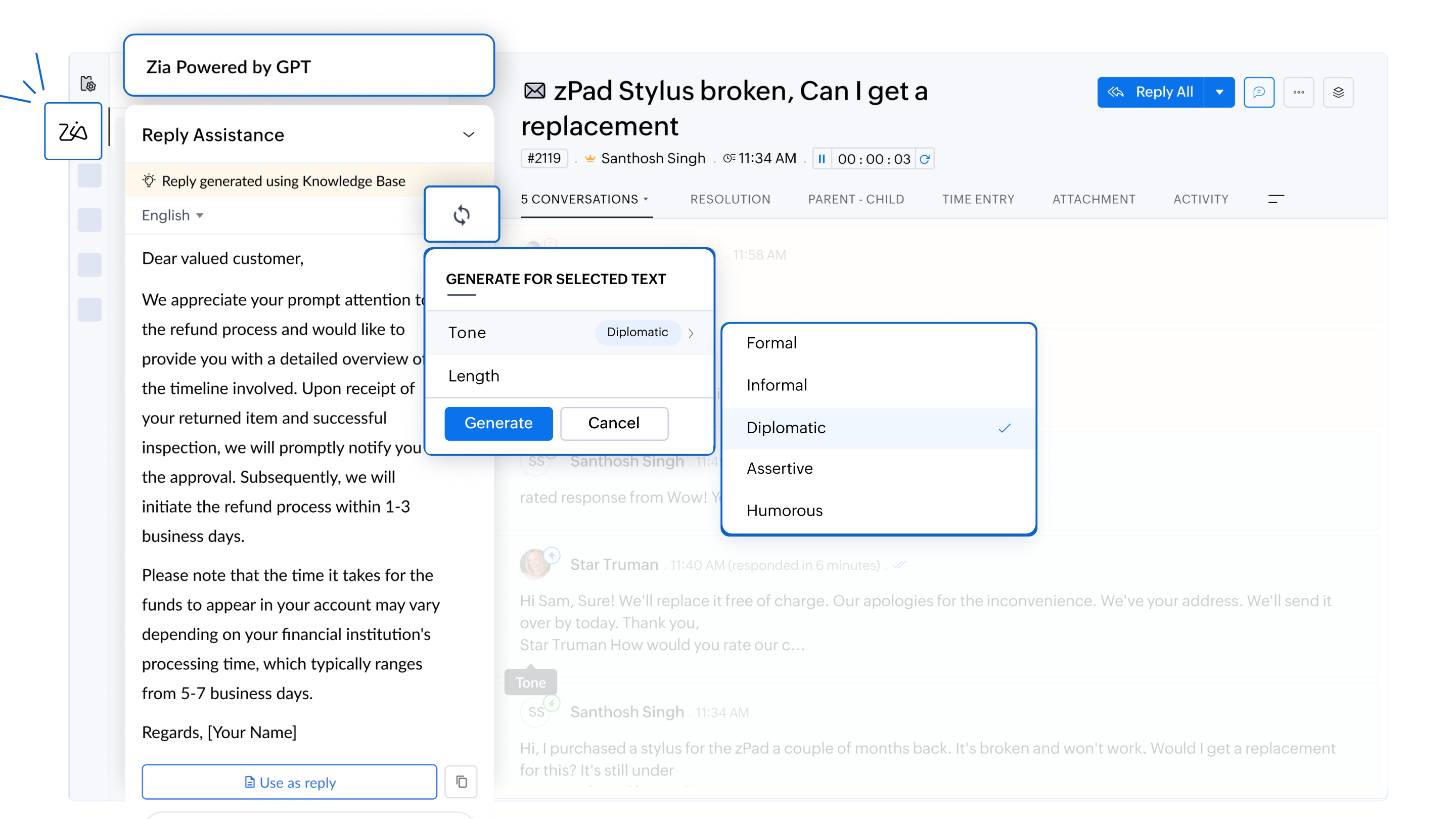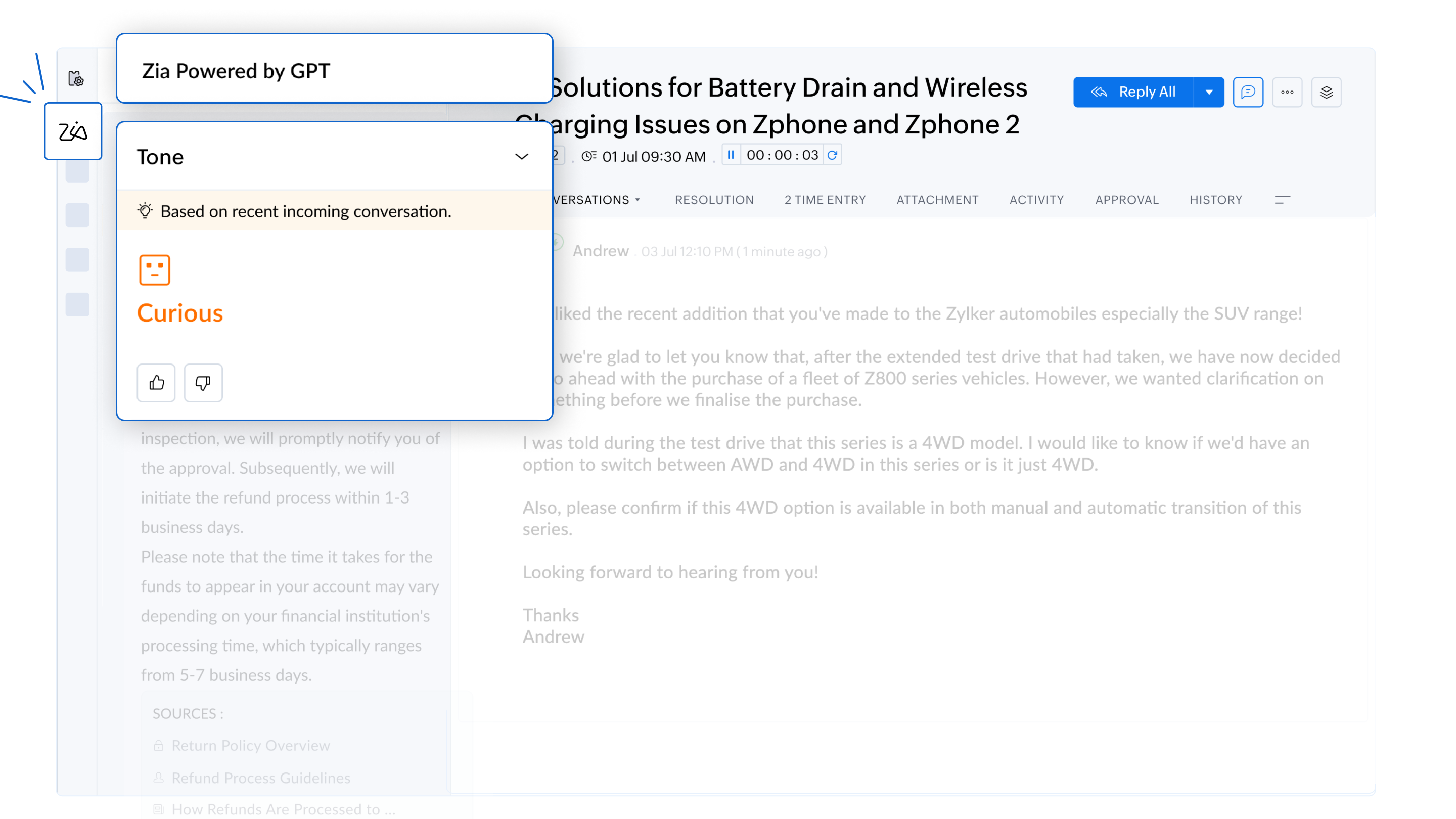 By analyzing the tone and sentiment, Zia helps agents draft responses that align with the emotional context of the conversation. Whether the situation requires an apology for a delay or a friendly response to a simple query, Zia ensures every interaction feels personalized.