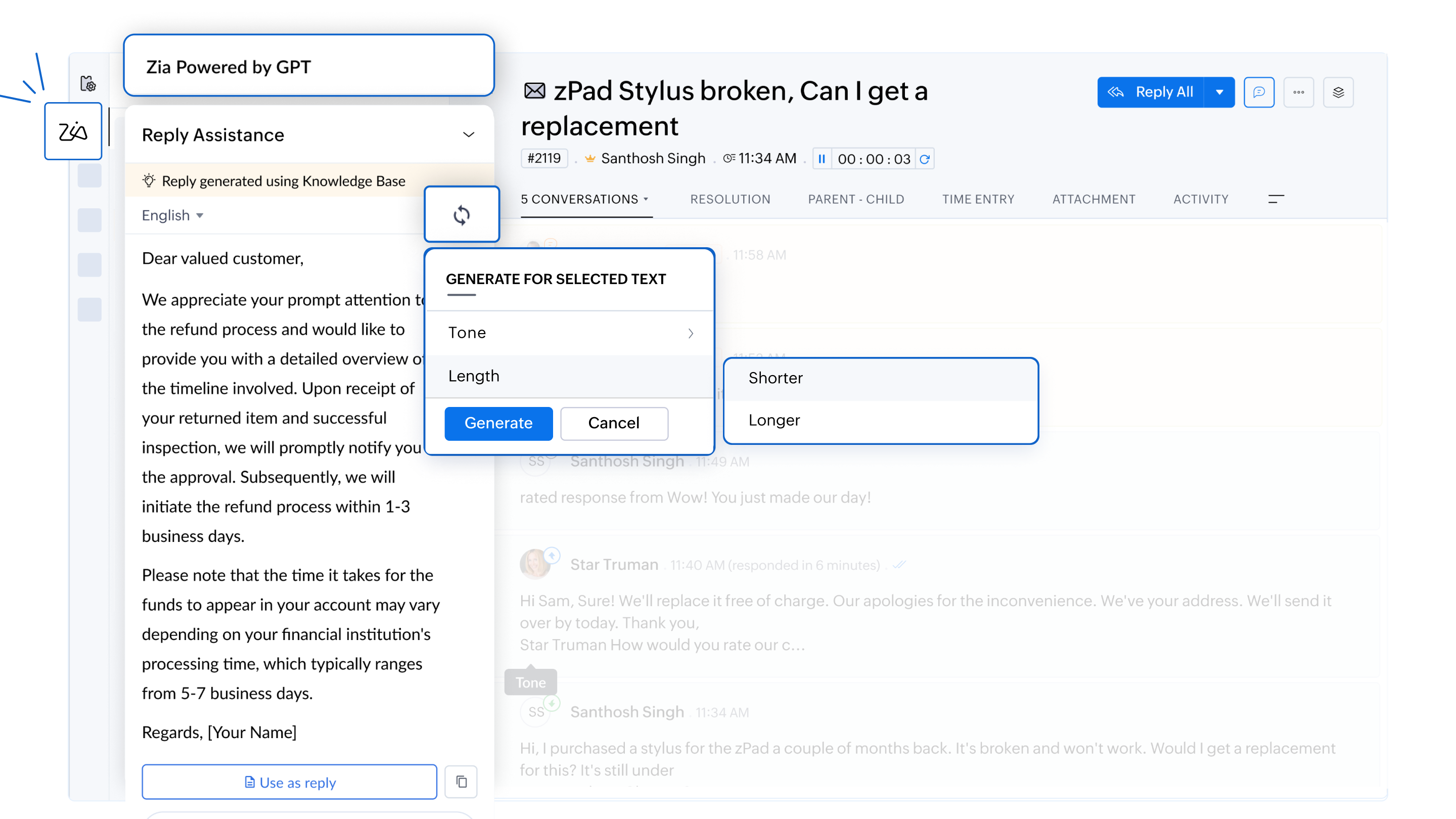 Zia enable agents to tailor the length of responses to suit customer needs. Whether a customer requires an in-depth explanation or a brief summary, agents can choose the most appropriate format to ensure clarity and efficiency.