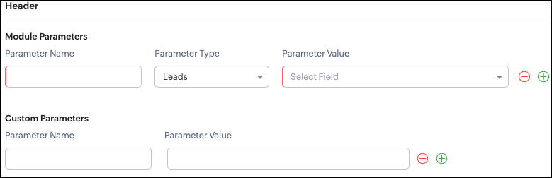 Module parameters allow you to send values from CRM fields inside the header. These values change depending on the record that triggered the webhook.