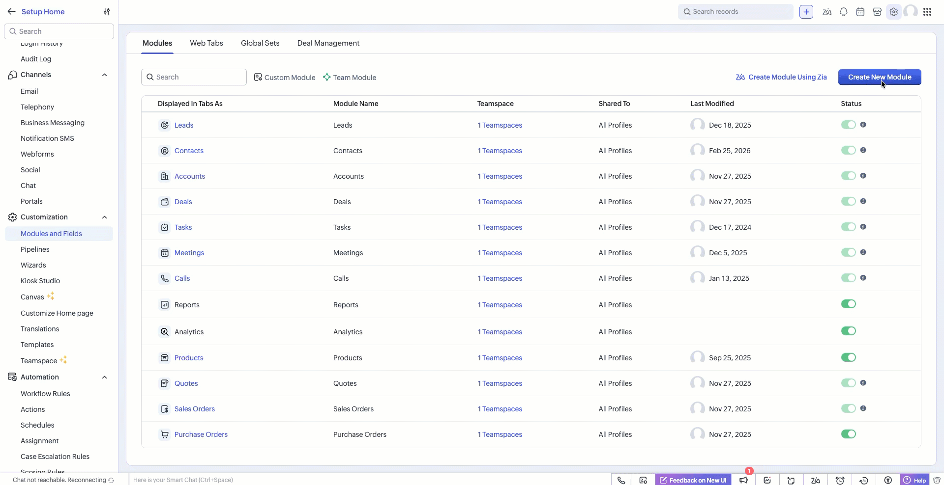 1. Go to Zoho CRM > Setup > Customization > Modules and Fields.