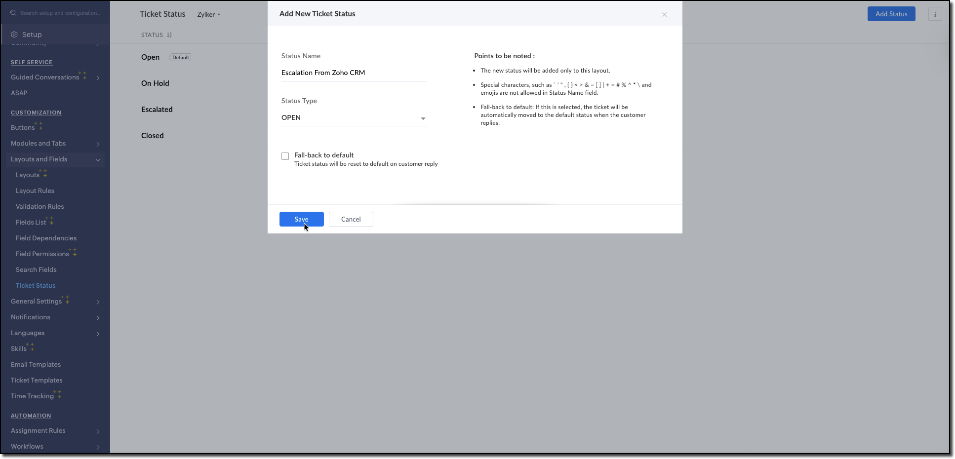 4. Create a custom ticket status in Zoho Desk to differentiate that the particular ticket is escalated from Zoho CRM.