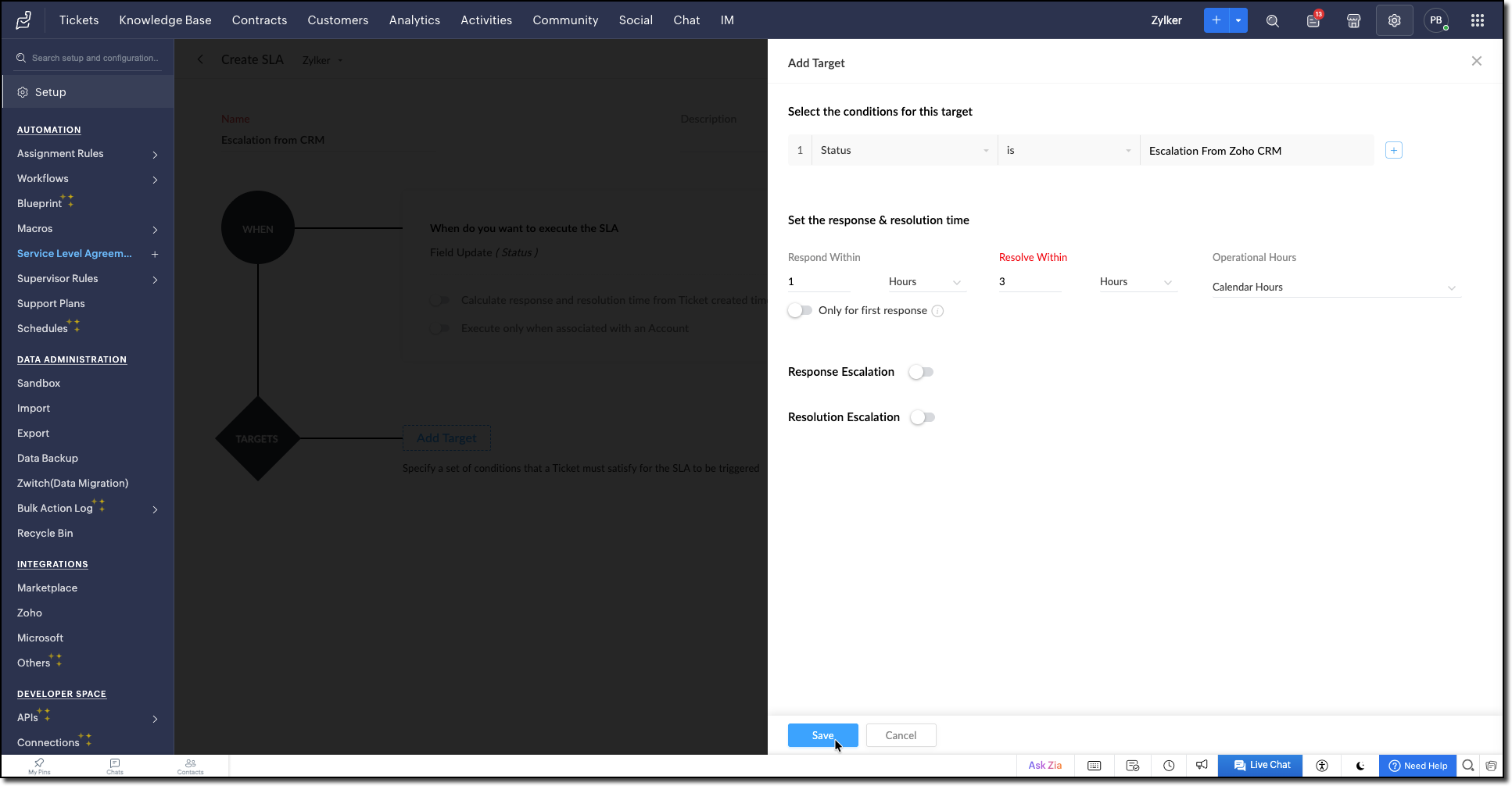 4. Create an SLA in Zoho Desk that triggers when the ticket status changes to Escalation from Zoho CRM.