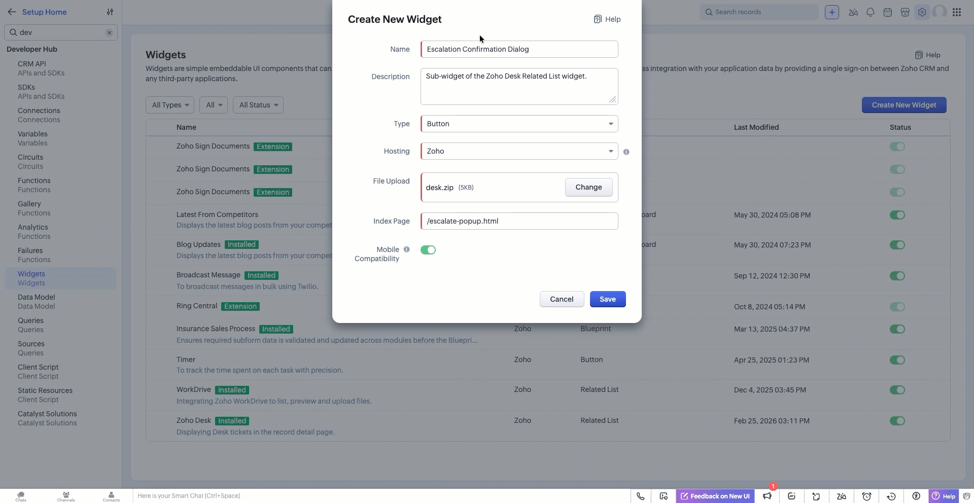 1. Go to Zoho CRM > Setup > Developer Hub > Widgets and click Create New Widget