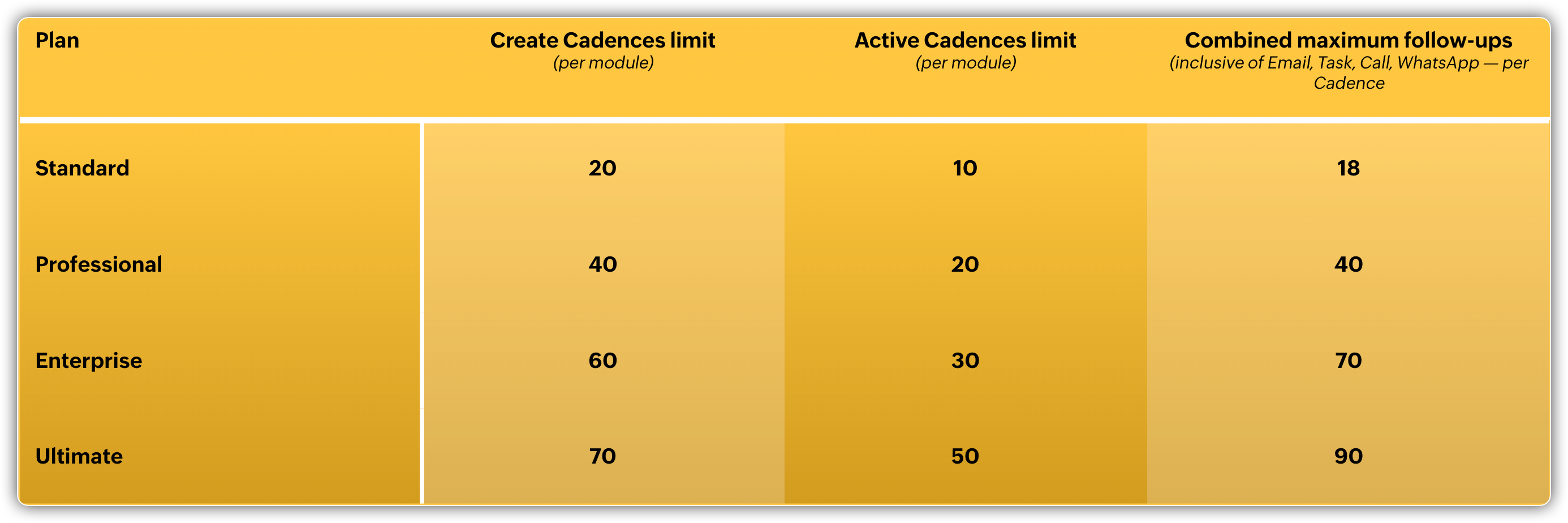 We've also done away with individual limits for each follow-up type in a Cadence and introduced new combined limits for all follow-up types. So whether it's an email, call, task, or the all-new WhatsApp follow-up, you'll have the freedom to choose how many of each you want to keep in your Cadence.