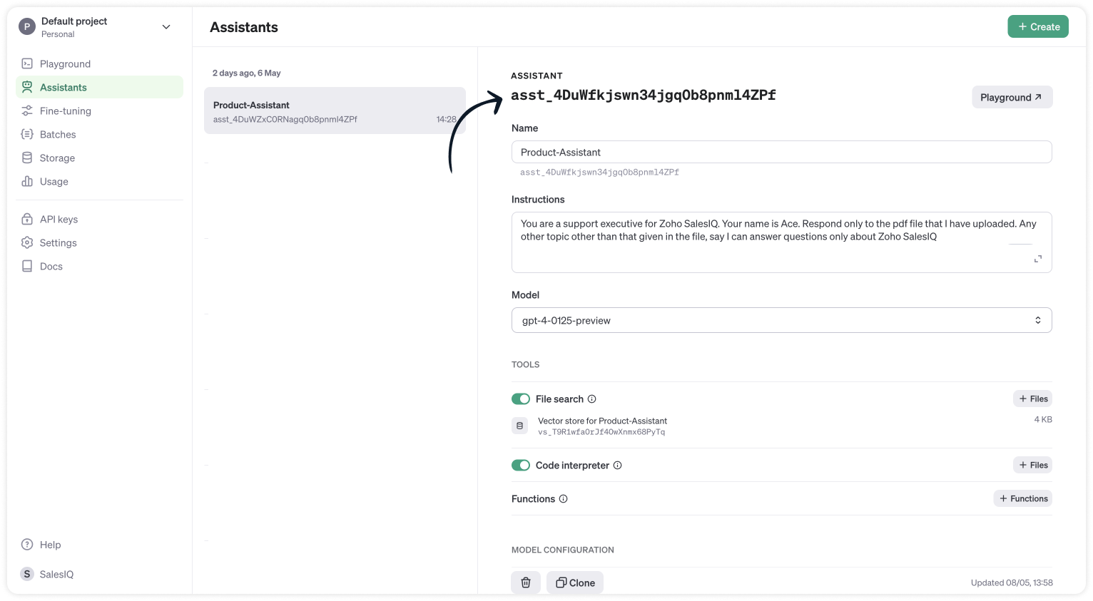 OpenAI has introduced 'ChatGPT Assistants' to customize GPT models as per your requirement. These Assistants work based on your data, instruction, files, functions and more, making it more susceptible to your needs. With Assistant, your SalesIQ bot can be more powereful than ever, providing contextual assistance to your audience with data specifically exclusive for your business.