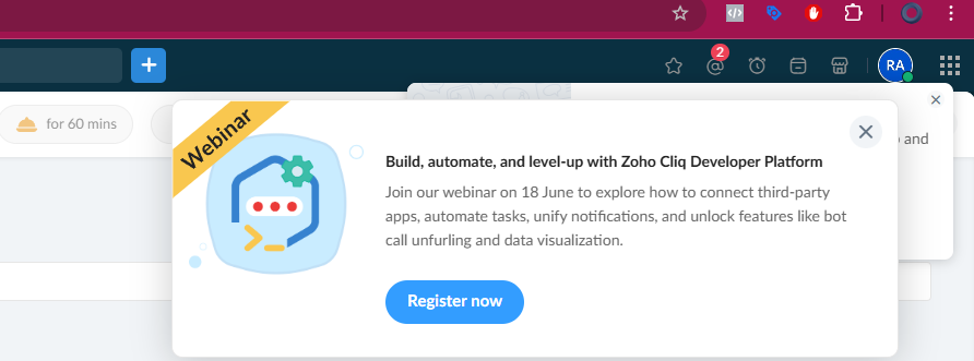 We would like to raise a feature request regarding in-app announcements in Zoho Cliq, such as the recent webinar popup about the Cliq Developer Platform: