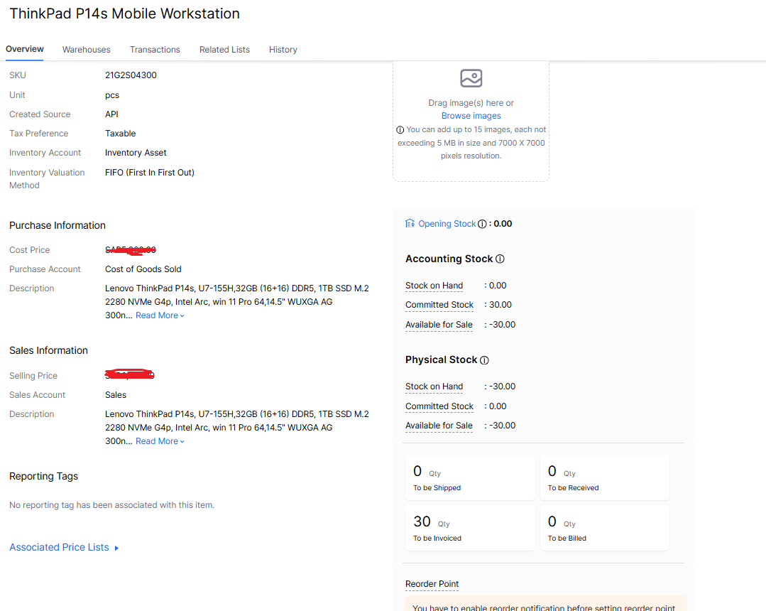 I tried to make an Inventory adjustment and change the Quantity of 30 Laptops to 0, but that doesn't change the committed stock in Accounting, and Physical Stock have Stock on Hand and Available for Sale is -30.