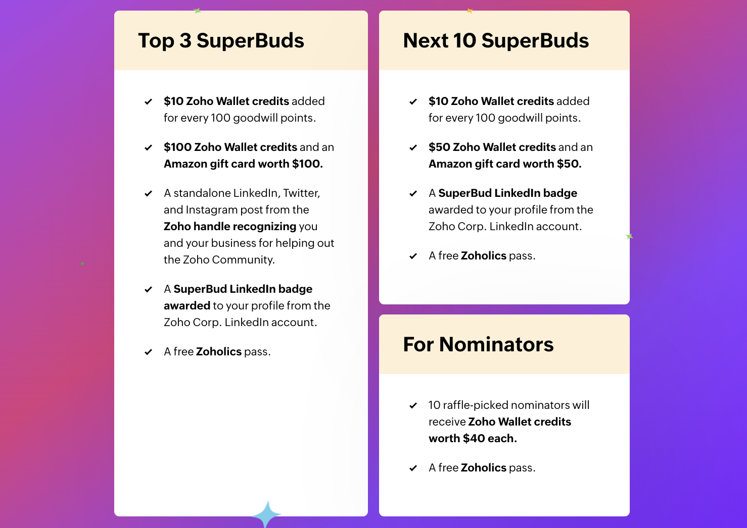 We'd like to use this as yet another opportunity to thank and appreciate our customers and partners for actively participating and contributing to the community and making it worthwhile for the members. We also want to create an avenue for our members to appreciate each other and have fun doing it. So, we are happy to roll out this Zoho SuperBud program, building up to the holiday season to recognize users who go out of their way to help the Zoho Community!
