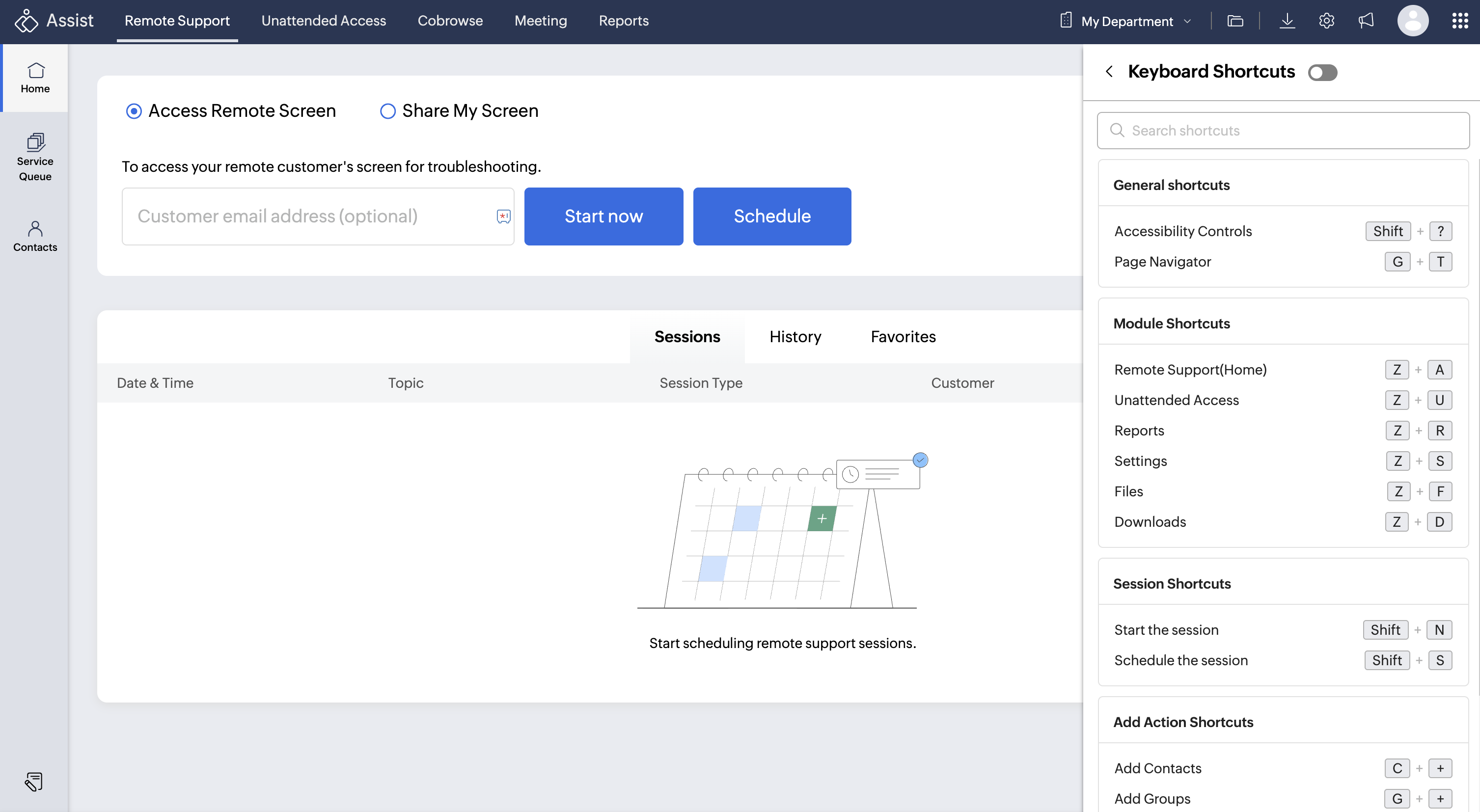 Quickly navigate Zoho Assist and perform actions using keyboard shortcuts. To view the complete list of shortcuts, press Shift + ?. You can also click on the View Shortcuts button to view the keyboard shortcuts.