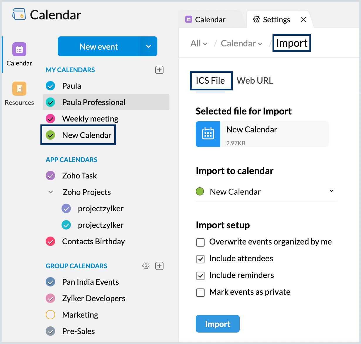 To import them into your Zoho Calendar, log in to your Zoho Calendar account. Navigate to Settings > Import > ICS file. Click Choose file. Select the ICS file of the calendar you want to import from your local storage. Choose the calendar into which you want to import those events. If you wish to create a new calendar to import those events, click +Create New and provide a name for the calendar. Click Save.