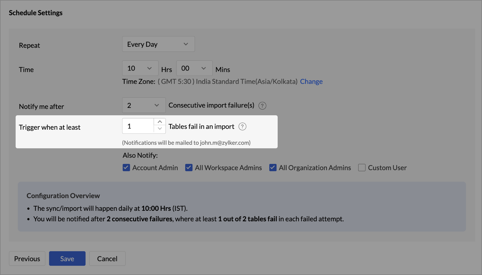 You can now configure synchronization settings to trigger a failure notification when a chosen number of table imports fail. Simply set the value for “n” failed tables, and Zoho Analytics will notify you when the condition is met. This gives you more control over monitoring imports and helps avoid missing critical sync issues.