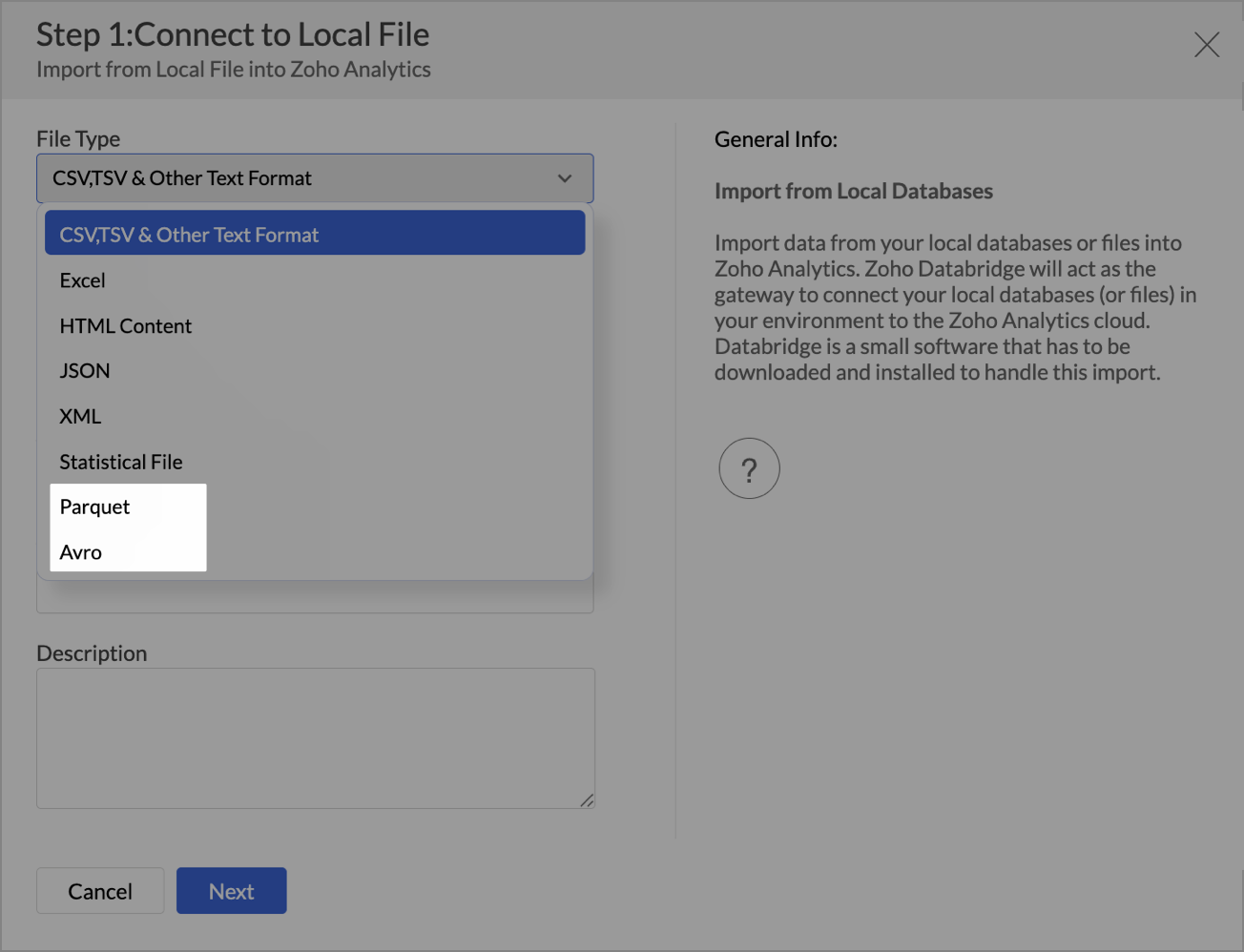Until now, Zoho Analytics supported large file uploads only for CSV files. With this update, you can now upload files larger than 100 MB for the following formats through Zoho Databridge: - Excel