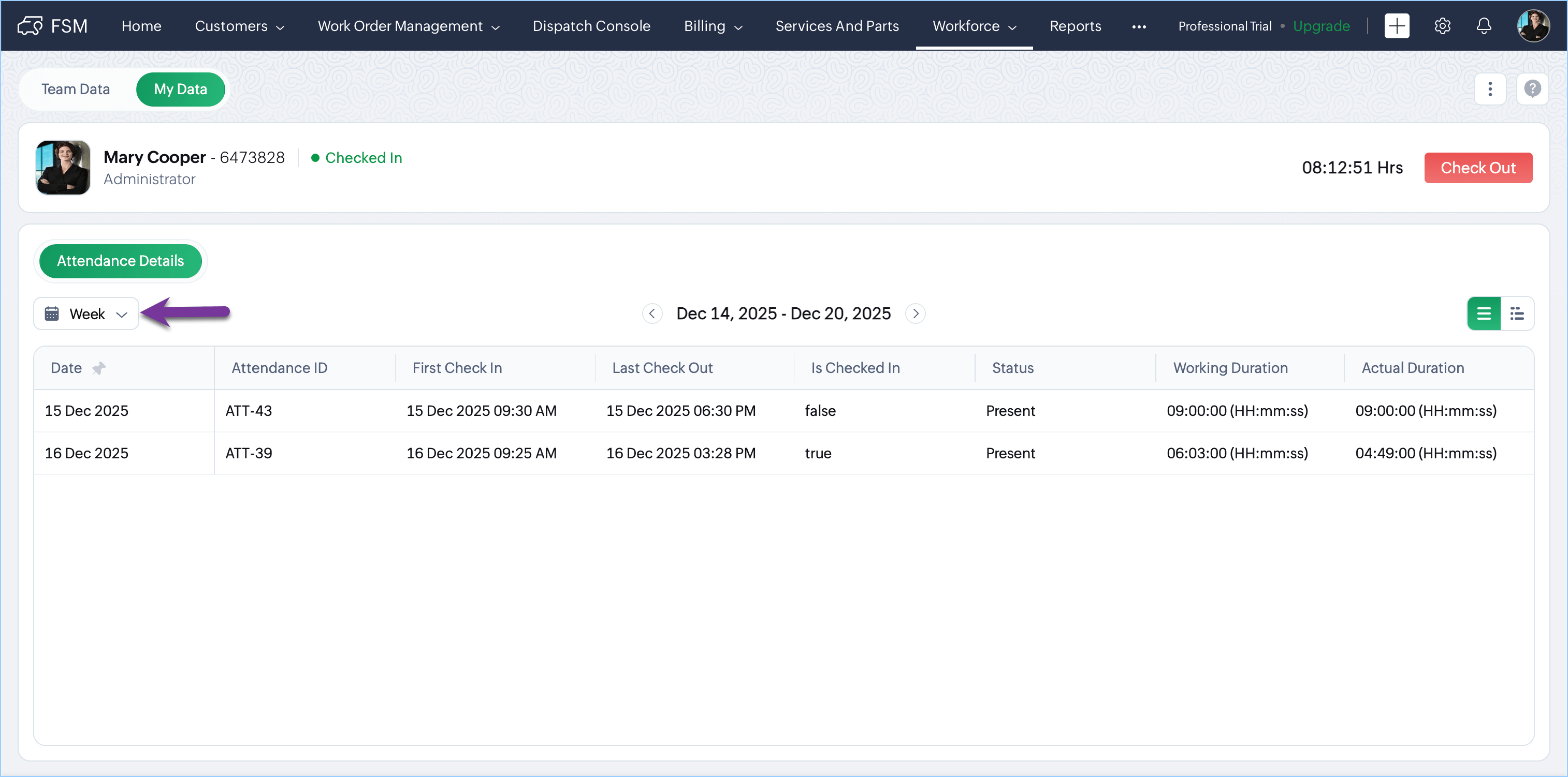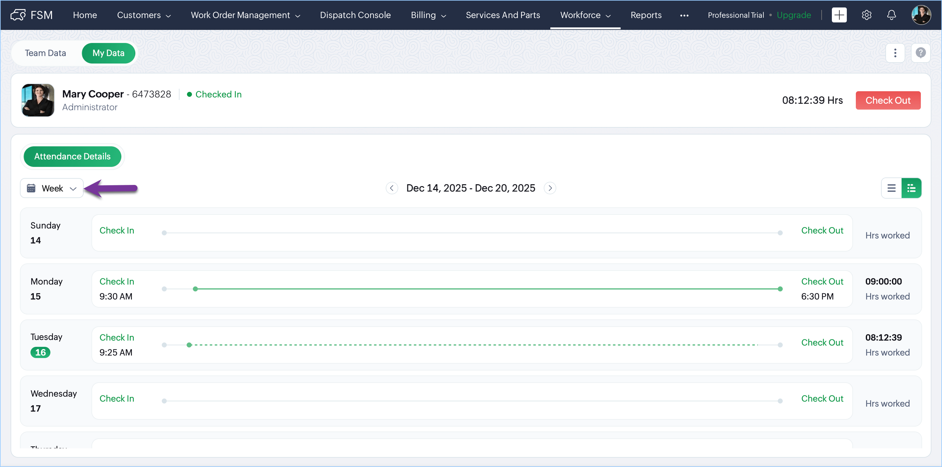 The My Data tab is designed for individual users to review their own attendance details. You can switch between Week and Month views using the dropdown on the left.