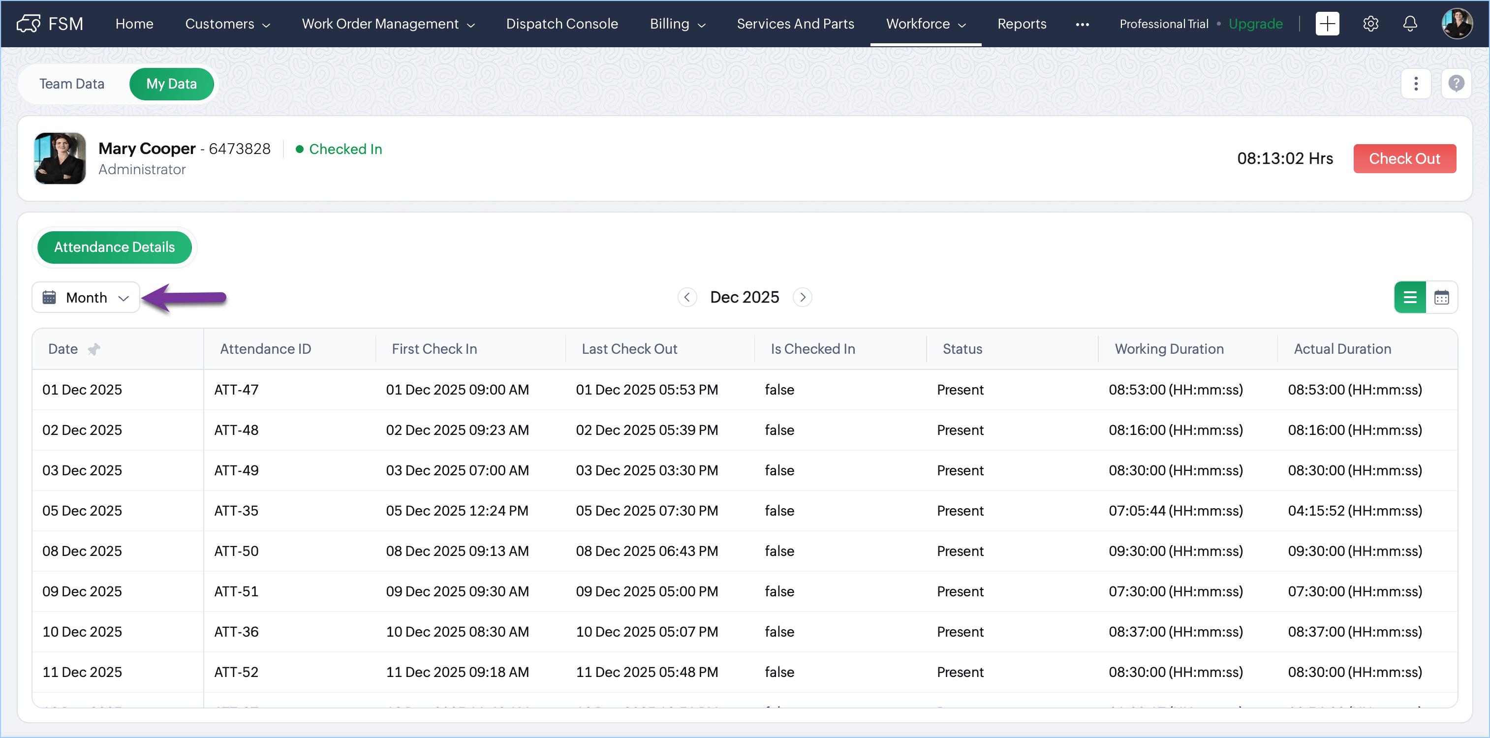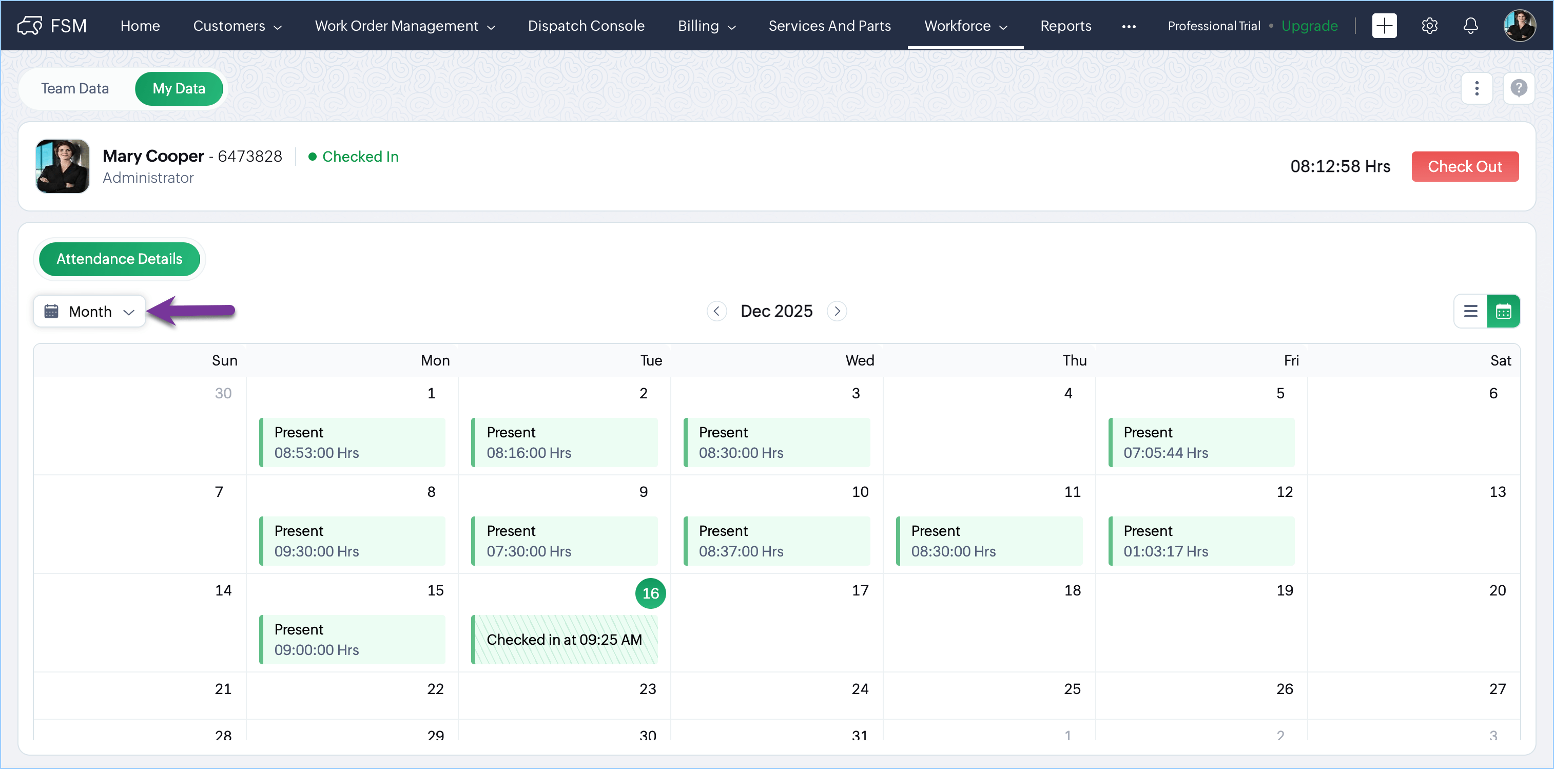 - List View: Shows your attendance entries in a tabular format for the entire month.