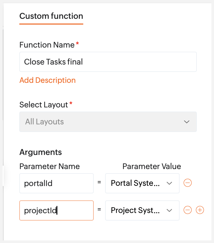 Custom Function and add the Deluge script below. Replace 'xxxxxxxxx' with your Zoho Projects connection name, and map the arguments listed below.