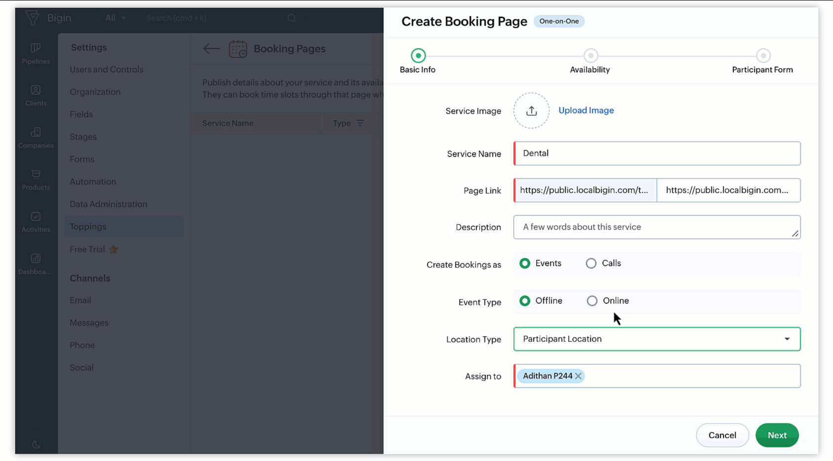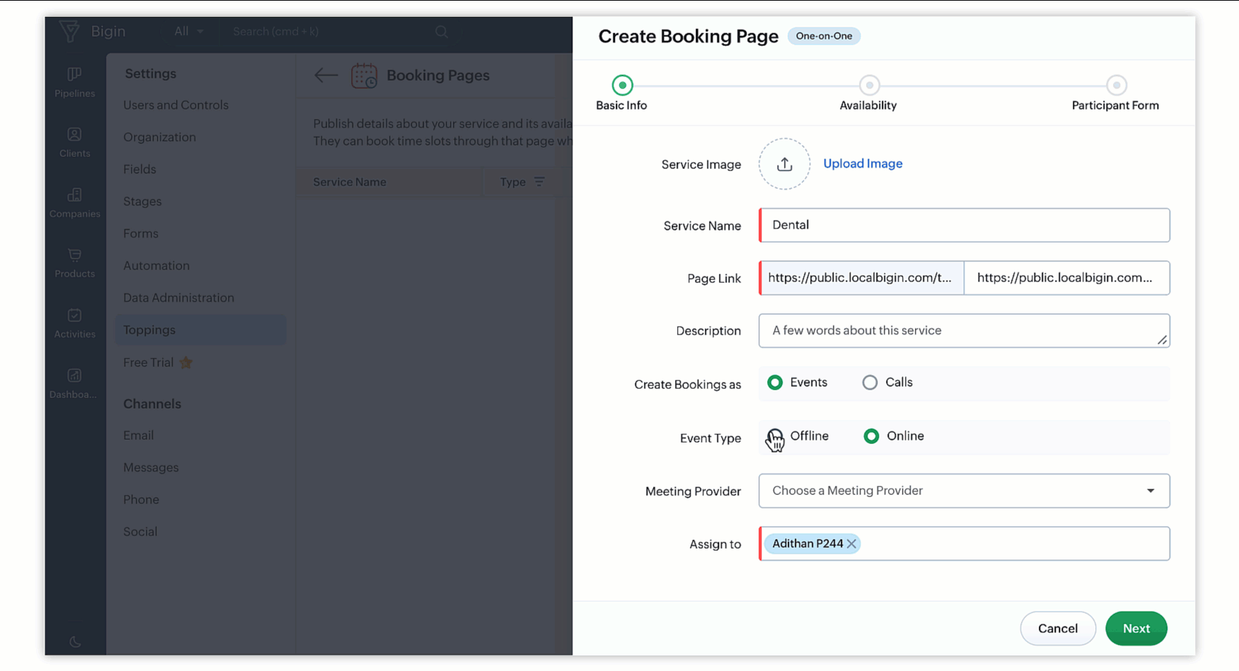 When you create a Booking Page, you'll now first choose the event type and fill in the necessary details. If it's an online meeting, you can select your preferred meeting provider (Zoho Meeting or Zoom Meeting).