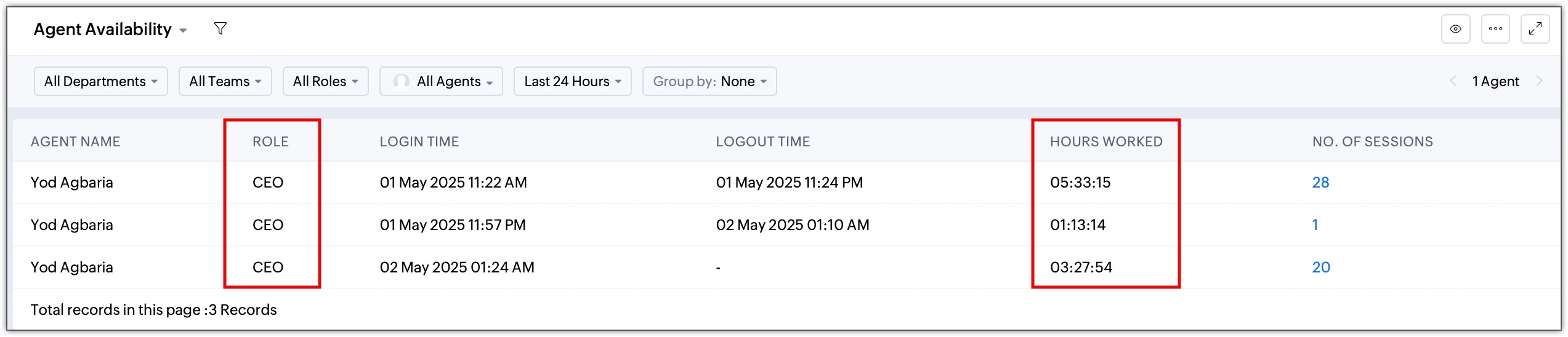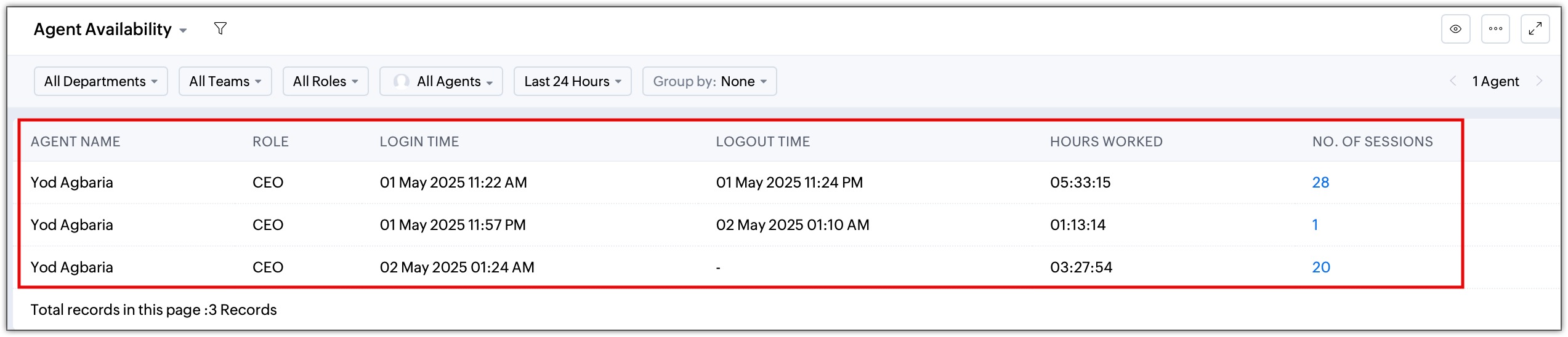 For example, if an agent, logs in from 9:00 AM to 12:00 PM, takes a lunch break, logs back in from 1:00 PM to 3:00 PM, then takes another break and logs in once more from 3:30 PM to 5:00 PM, the agent availability report would show a total of 6.5 hours worked across 3 sessions for the day.