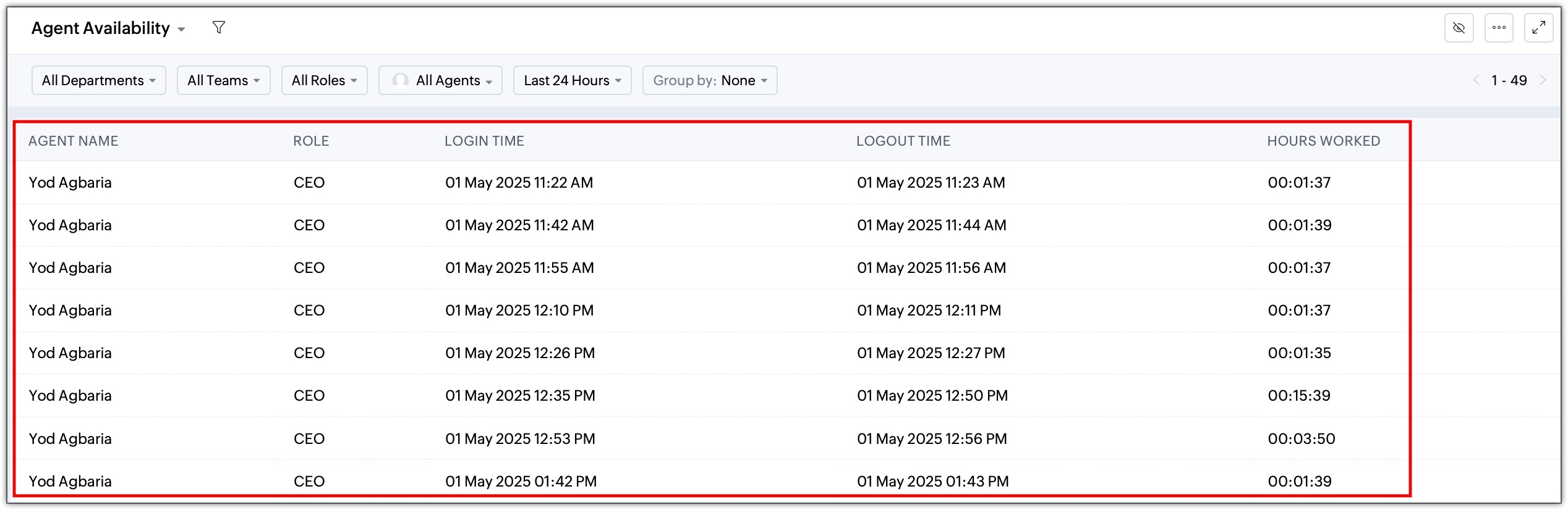 - Hours worked: Managers can easily track the total work hours of an agent by referencing the Hours Worked column, which calculates the time difference between login and logout.