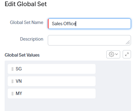 i currently have a new field that is called sales office which we use for permission settings between our different offices located in different countries. It is a global set picklist with three different options: MY, SG and VN.