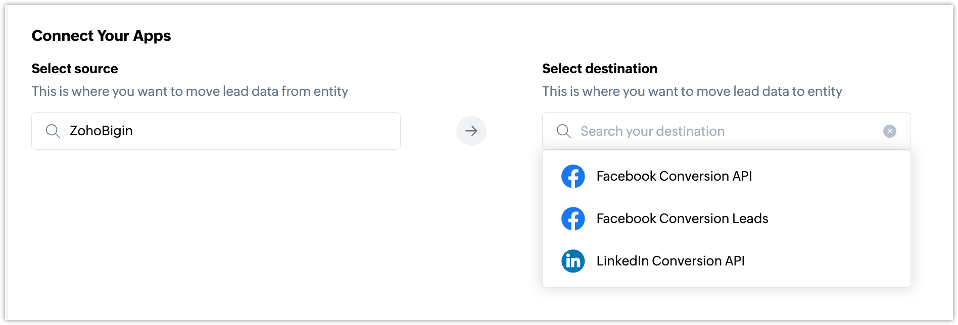 We're excited to introduce a new topping in Bigin called LeadChain by Zoho Social. LeadChain instantly syncs lead information from social media lead ads to Bigin, making it easier to turn them into customers. It also helps you send conversion data back to the social channels for better targeting, saving you time and effort.