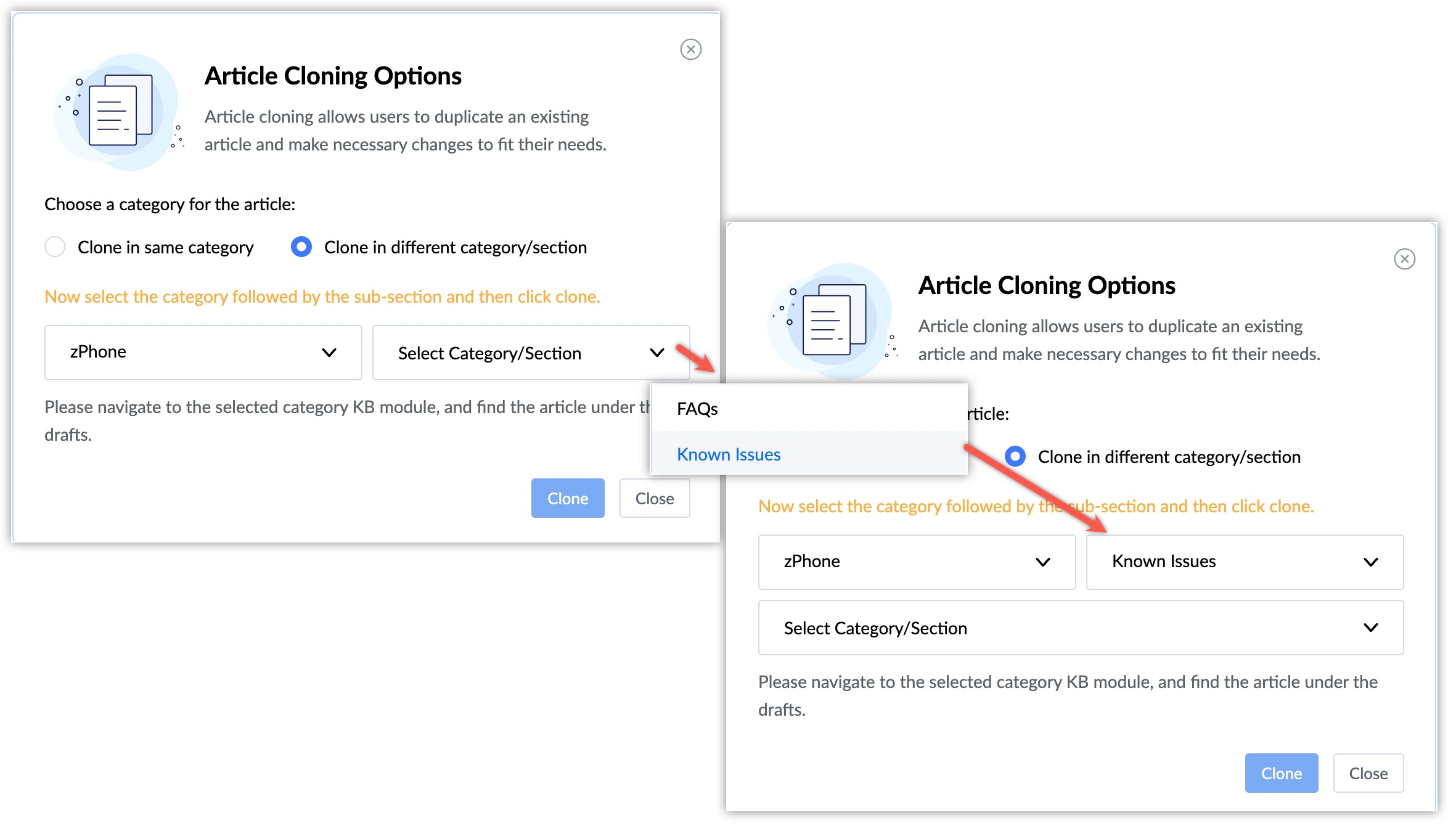 While creating a new article, writers can clone any published article and use the format. Instead of selecting the category, section, and subsection after cloning, they can now set these during the cloning process.