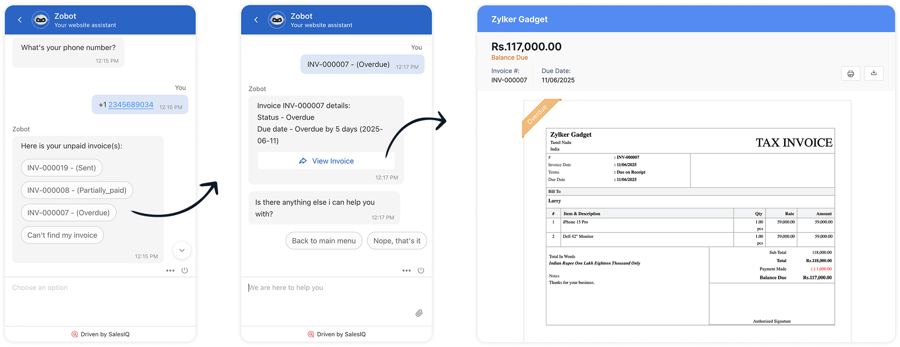 Using Zoho SalesIQ's Codeless Bot Builder and this ready-to-use plug, your bot can instantly fetch and display customer invoices based on their phone number, helping visitors view unpaid invoices, check past payments, and access invoice links without manual assistance.
