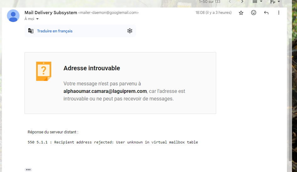 Quand quelqu'un m'envoie un email, je ne le reçois pas. Je viens de souscrire cet abonnement pour une période d'essai, mais j'ai envoyé plusieurs emails à la seule adresse que j'ai créée en attendant, mais je ne les reçois pas. il rejette