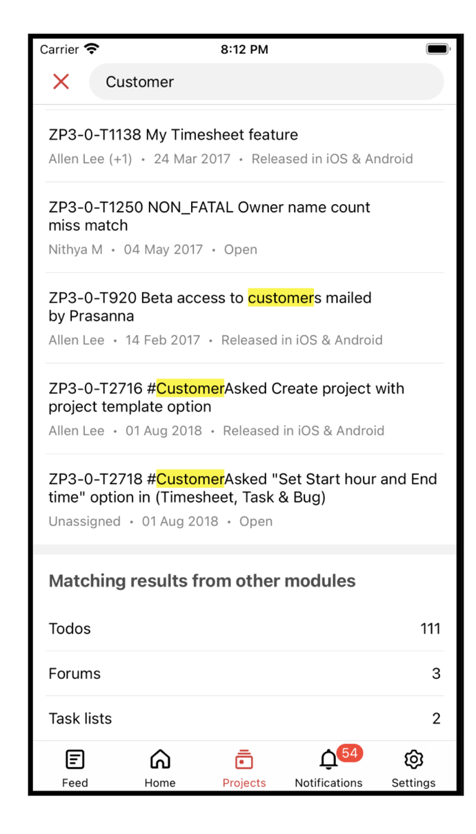 In the latest version of the Zoho Projects iOS app (v3.5.3), we have brought in support for global search.