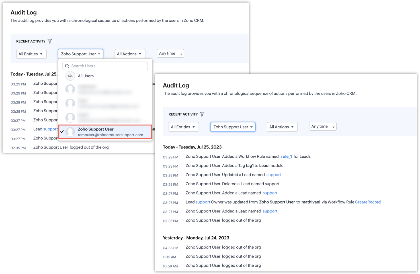 - As a customer, if you wish to see all of the changes made by the support user, you can view them in the audit log.