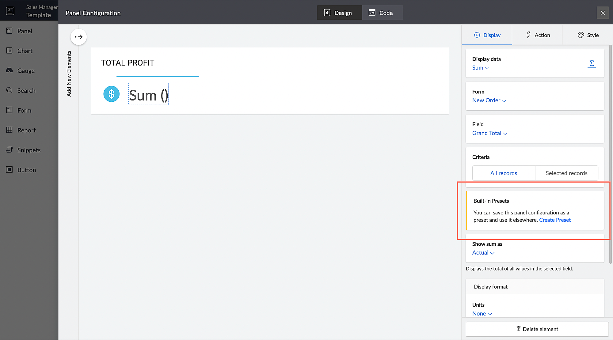 Presets are required in cases, where a configured aggregate value needs to be displayed in more than one panel, like if a user needs to display the Total Profit value in their dashboard, both as an actual value and as a percentage value. In this particular case, the user will have to manually configure the Total Profit value in two panels and choose a different Show As value (Actual in one panel and Percentage of a number in the other panel) in each panel. Using the preset capability, users can save the configuration and reuse it in different panels with only the Show As value being different.