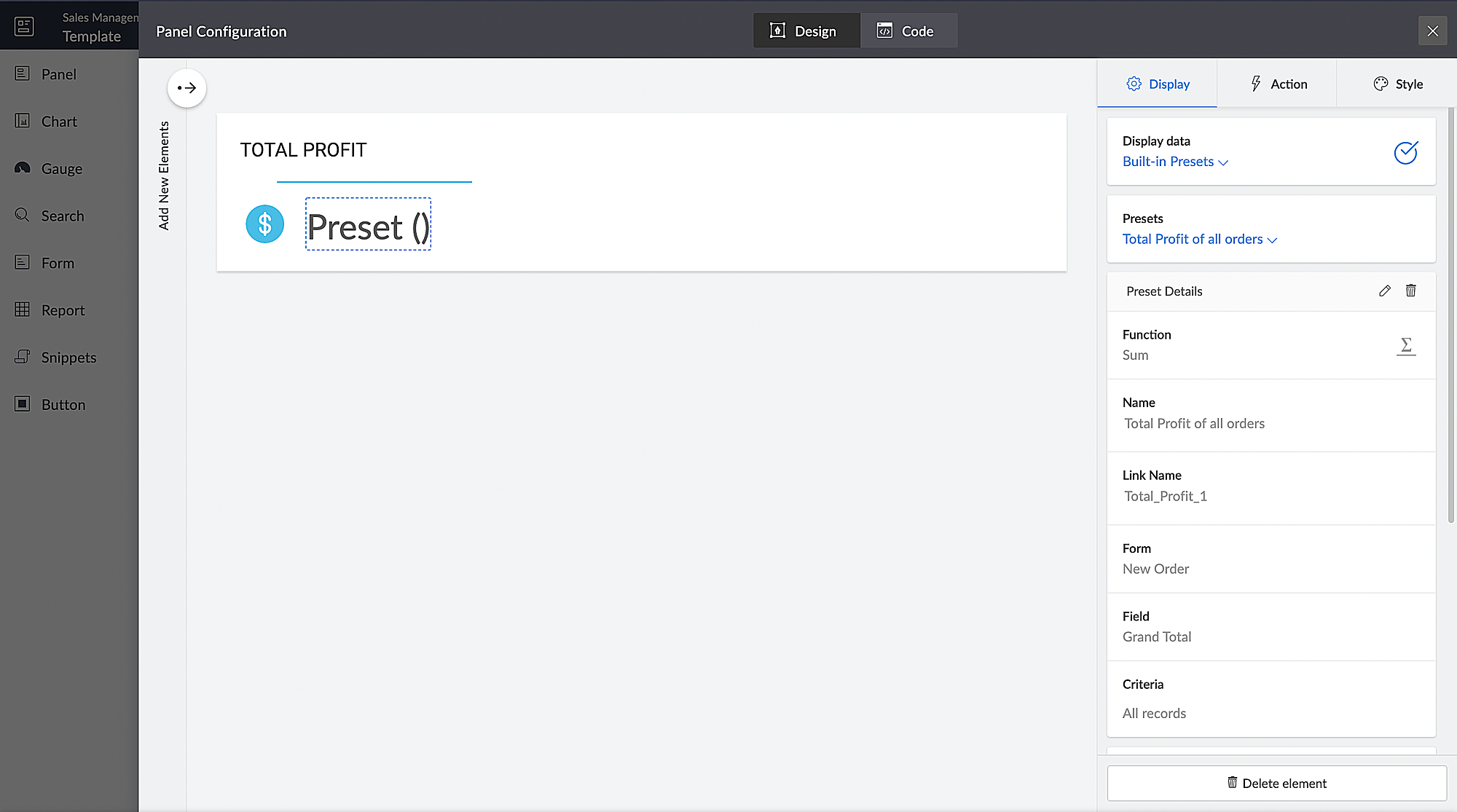 You can configure aggregates to be displayed on page panels. Currently, if such a configuration needs to be reused on a different panel on the same page or on a different page, it has to be manually reconfigured. With presets, the aggregate configuration can now be saved and used across apps in your Creator account, thereby preventing repeated manual configurations. The created presets will be available as a dropdown inside the panel element.