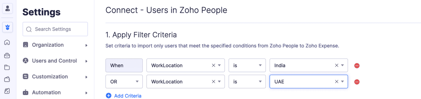 Set criteria and import only the users who meet the specified criteria into Zoho Expense. Once you integrate with Zoho People, you can sync its modules with Zoho Expense. Under the Users section, click Configure Now and set the criteria that will be used to filter and sync users into Zoho Expense.