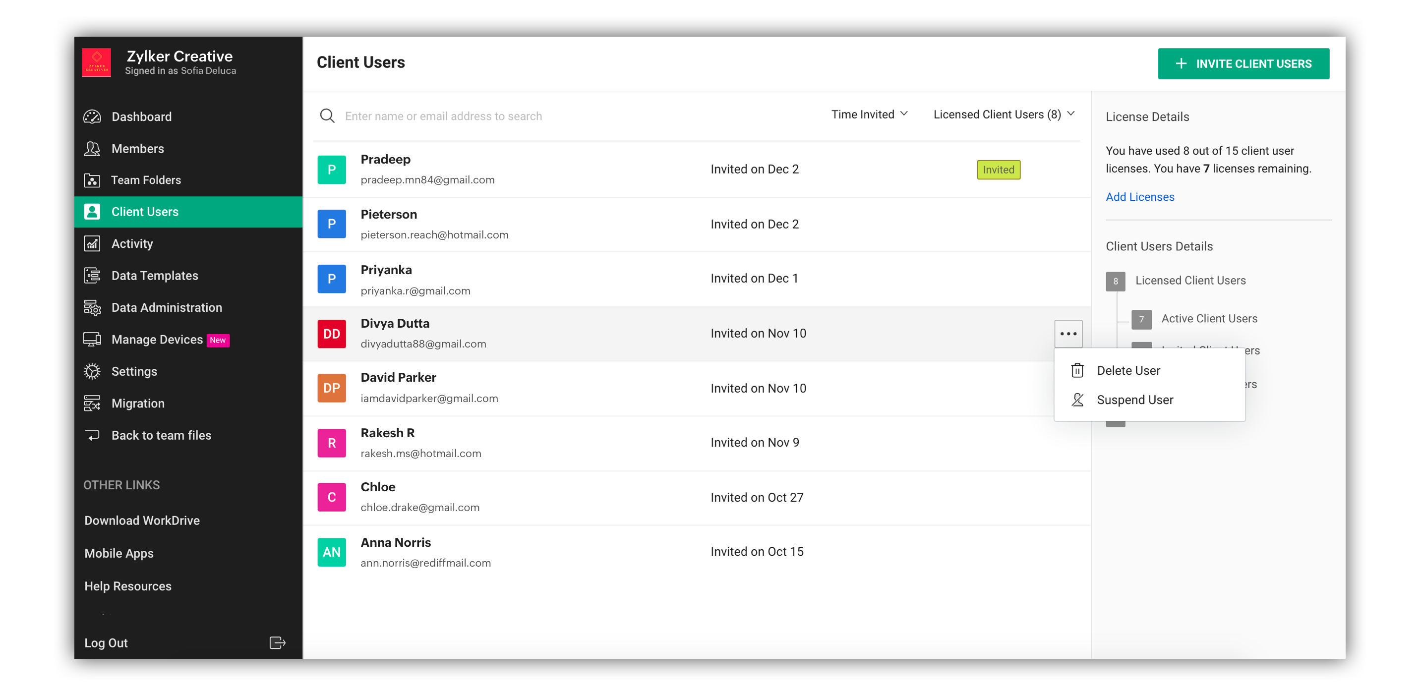 - 暂停用户:这将阻止客户用户登录团队帐户,并会断开他们以前连接的所有设备与 WorkDrive 应用之间的连接。您可以稍后激活或删除这些用户的帐户。